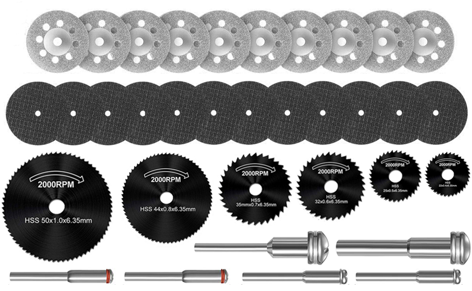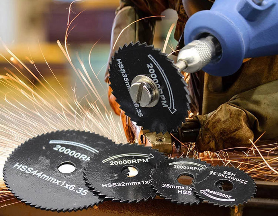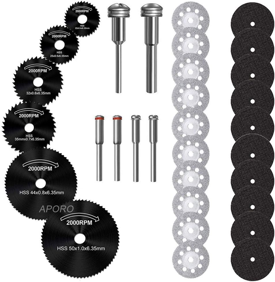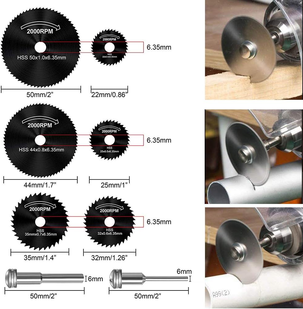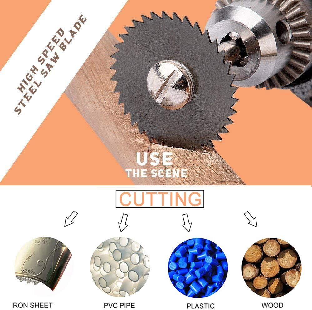 2. مجموعة شفرات المنشار الدوارة الفولاذية عالية السرعة (6 عبوات): مجموعة شفرات المنشار والشياق هذه مثالية للتقطيع الدقيق في الألومنيوم والنحاس والنحاس والخشب والبلاستيك. كل شفرة منشار مصنوعة من الفولاذ عالي السرعة لضمان المتانة القصوى.