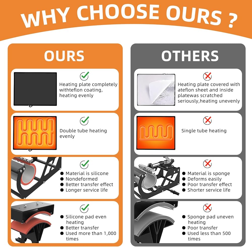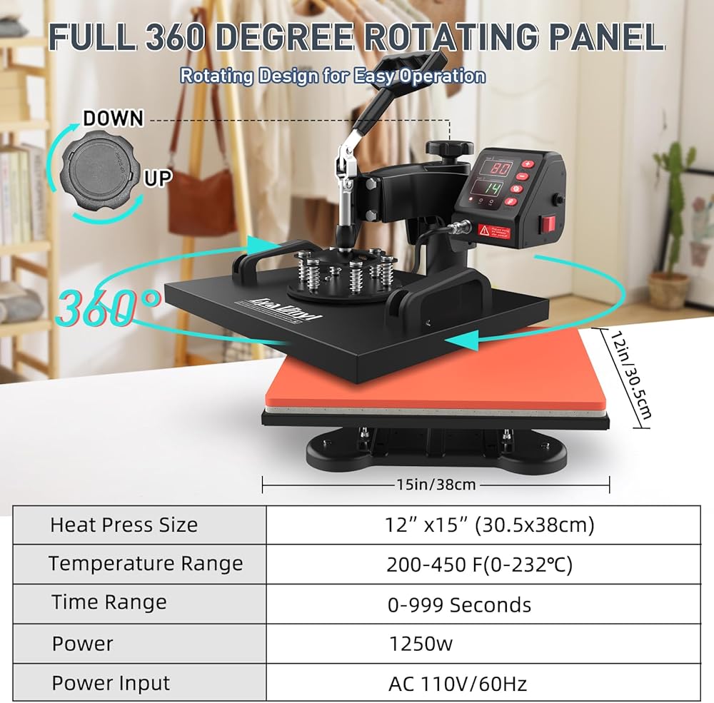 「سهلة الاستخدام」- تم تصميم آلة الضغط الحراري الخاصة بنا مع وضع المبتدئين في الاعتبار. إنه سهل التشغيل، بواجهة بسيطة وتعليمات واضحة، ويمكن استخدامه خارج الصندوق دون تجميع. سوف تقوم بإنشاء تصميمات مخصصة في أي وقت من الأوقات! تسخن آلة الضغط الحراري بسرعة وتوفر حرارة وضغطًا ثابتين، مما يضمن نقل تصميماتك بسلاسة إلى المواد التي اخترتها. الرجوع إلى الدليل والفيديو للحصول على خطوات محددة.