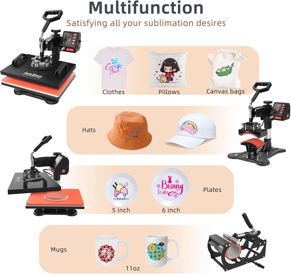 「متعددة الاستخدامات」- مجموعة الضغط الحراري تتضمن آلة ضغط حراري مسطحة، وآلة ضغط على الأكواب، وآلة ضغط على القبعة. يمكن استخدام آلتنا على مجموعة متنوعة من المواد، بما في ذلك القطن والبوليستر وحتى السيراميك. إنه مثالي لتخصيص القمصان والقبعات والحقائب والأكواب والمزيد.