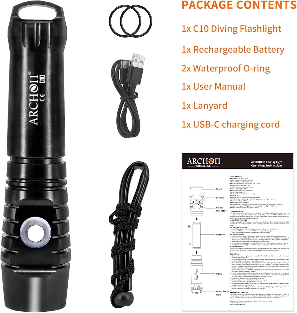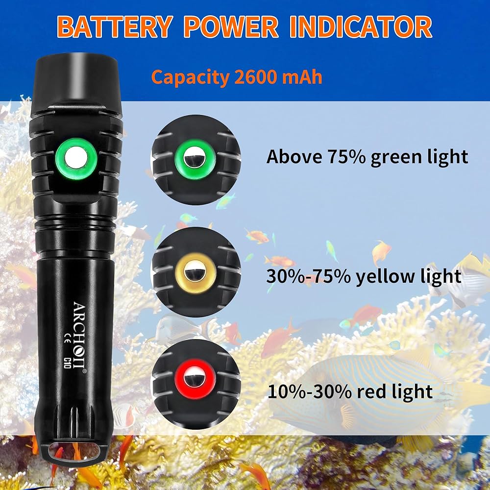 ARCHON C10 مصباح يدوي للغوص تحت الماء 100 متر مقاوم للماء، ضوء كشاف أبيض 1200 لومن مع مؤشر الطاقة.