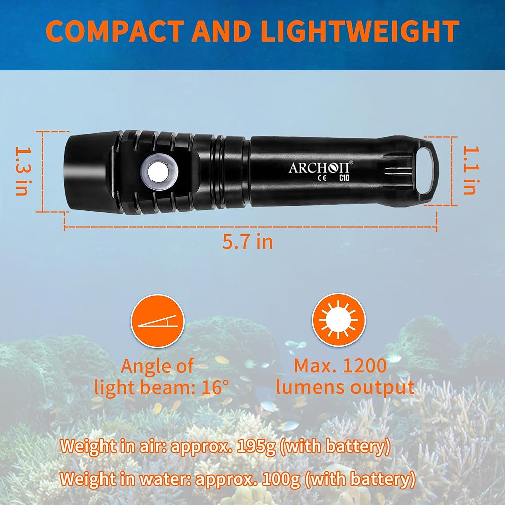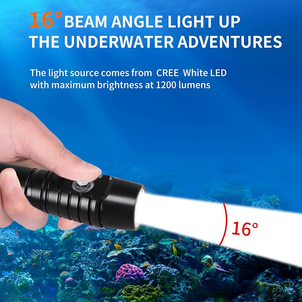 • BACKUP FLASHLIGHT: Using a Luminus LED with brightness up to 1200 Lumens and a 16-degree narrow beam light-cup. Extra-long illumination distance can well meet the water lighting needs. Small size and long illumination time, it is the best choice for spare dive light.