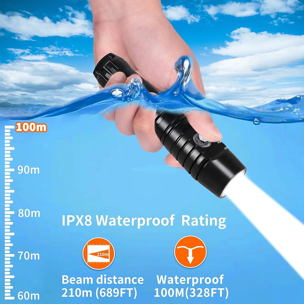 • MULTIPURPOSE: This scuba diving flashlight is a professional diving flashlight that can be used for recreational and leisure diving. At the same time, with the small size and high brightness, dive flashlight can also be used as a backup light for technical diving activities. Underwater flashlight can also be used for outdoor hunting, camping lighting, home emergencies, etc.