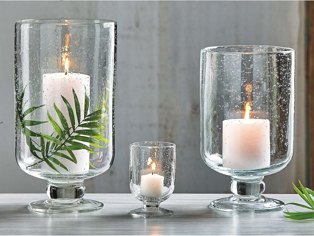 Elegantly footed hurricane can be enjoyed as a vase or a candle holder. Handmade of bubble glass. Can be used for candles or decor.