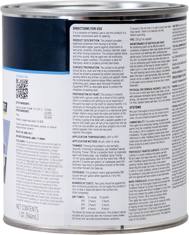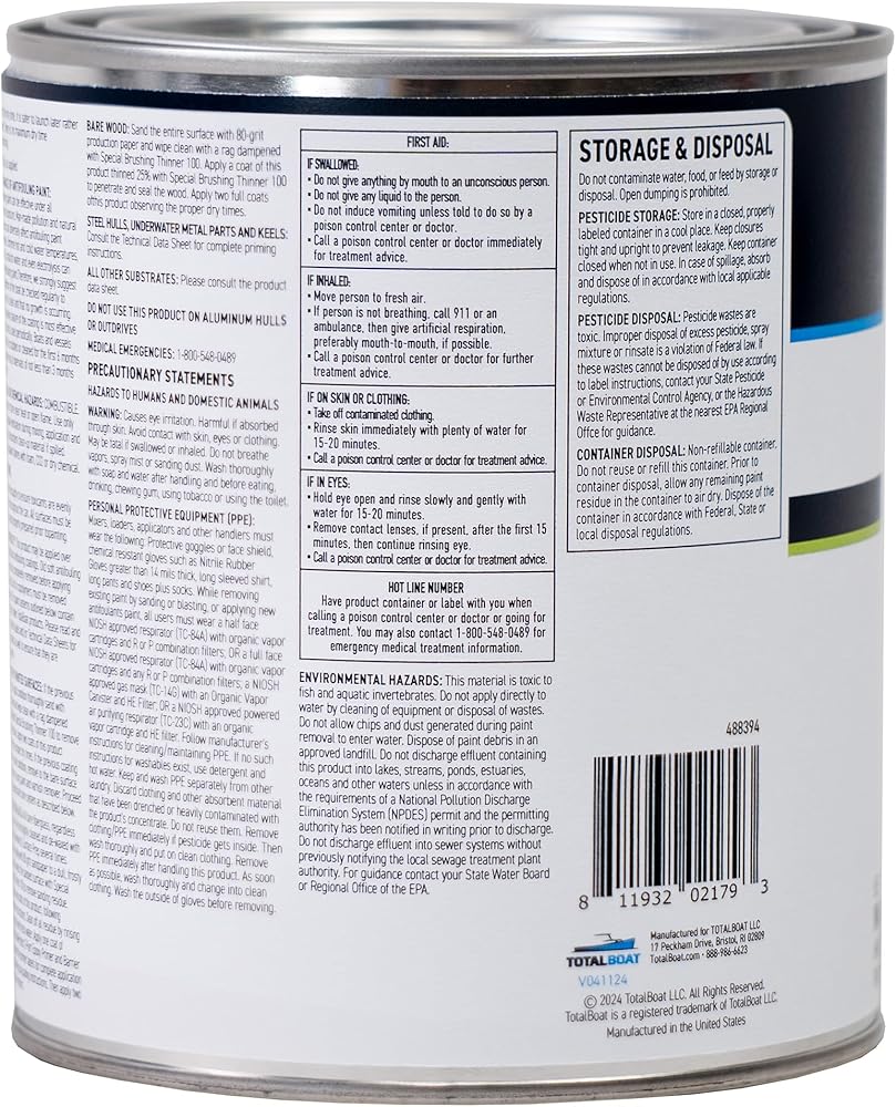 • سهل التطبيق، يجف بسرعة: يوضع عن طريق الفرشاة أو الدحرجة أو الرش على الألياف الزجاجية والخشب والفولاذ والأسطح المطلية مسبقًا في ظروف جيدة. التخفيف: تطبيق الفرشاة/الأسطوانة - TotalBoat Special Brushing Thinner 100؛ تطبيق الرذاذ - مخفف الرذاذ TotalBoat 101