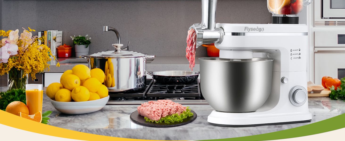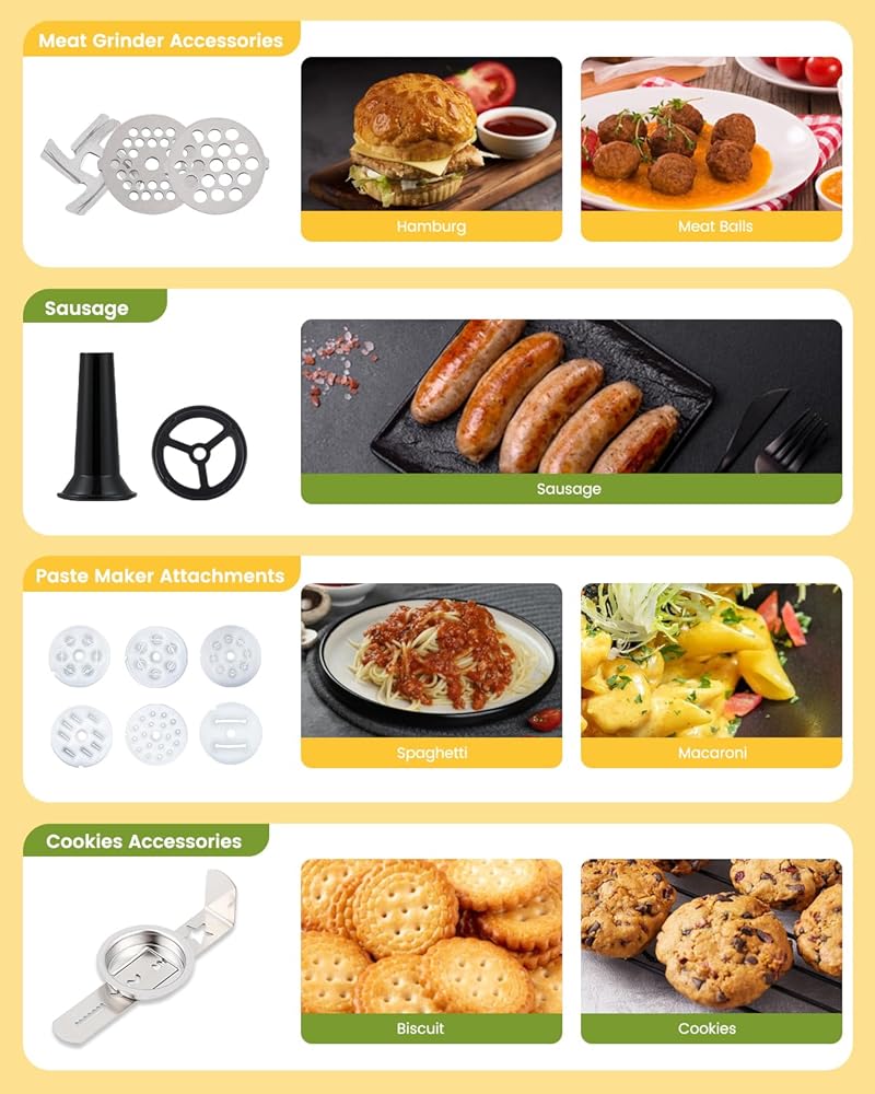 خلاط متعدد الوظائف 7 في 1: وعاء خلط من الفولاذ المقاوم للصدأ بسعة 6.5 لتر يمكن أن يحتوي على 20 بياض بيضة. مجهزة بمطحنة لحم وكوب عصير سعة 1.5 لتر وملحقات مختلفة مثل البسكويت والنقانق والمعكرونة، يمكنك خلط عجينة الخبز والخليط السميك والكريمة المخفوقة وصنع البسكويت والنقانق وكرات اللحم أو العصير.