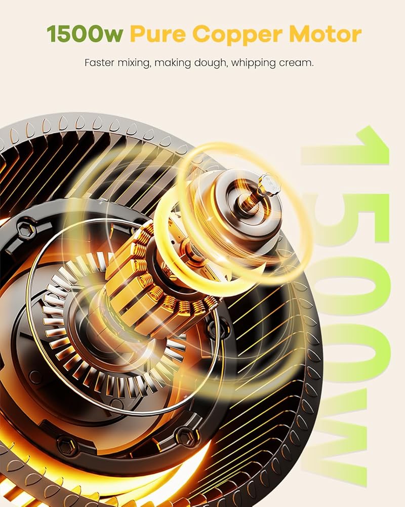 محرك نحاسي نقي وخلط كوكبي: يحتوي الخلاط الكهربائي متعدد الوظائف على محرك نحاسي نقي بقدرة 1500 واط، مما يجعله أسرع في الخلط. اختر من بين 6 سرعات، سواء التحريك البطيء أو الخلط السريع، فهو مثالي لوصفات مختلفة. يضمن نظام الخلط الكوكبي خلطًا شاملاً وموحدًا لجعل مذاق الطعام أفضل!