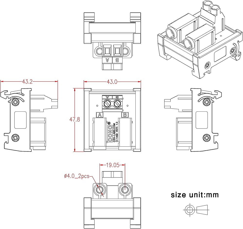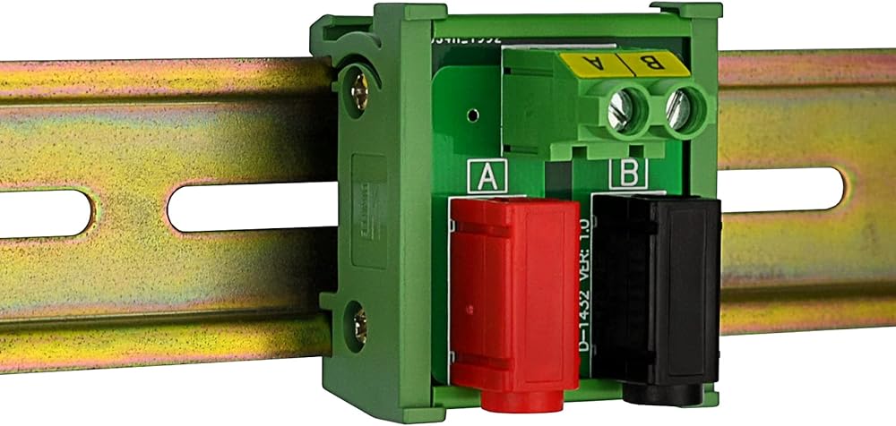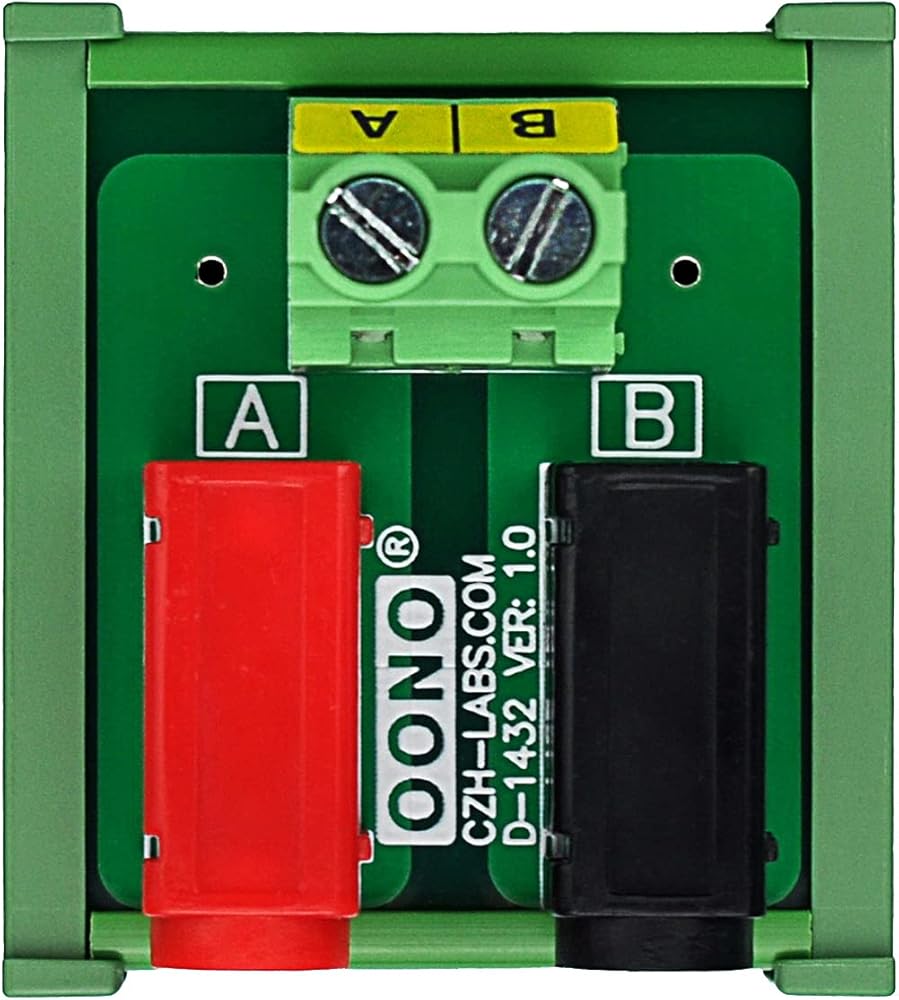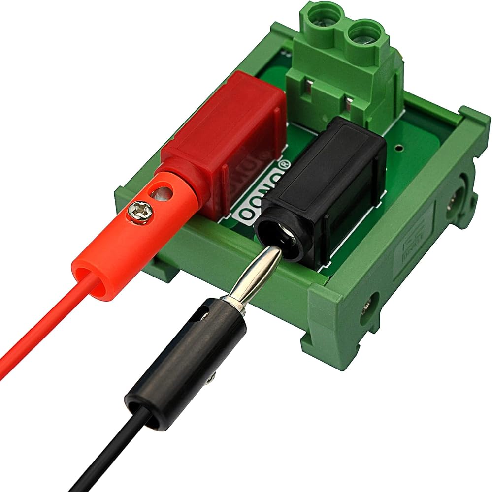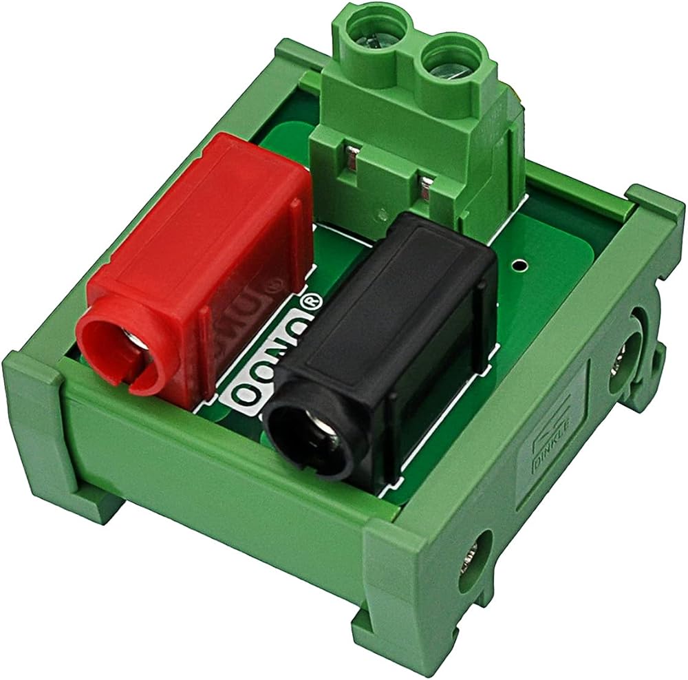1, DIN Rail Mount 2 x 2 Positions Banana Jack Breakout Board Module. 2, A and B position termianl blocks, maximum current 20 Amp (each position). Pitch 7.62mm/0.3", Wire range 26AWG ~ 10AWG / 4.0mm square, Strip length 8mm. Screws - M3,steel, Cr3+ Zn plated. Pin header and Cage - Brass. 3, A and B position standard 4mm banana jacks, maximum current 20 Amp (each position). Rated voltage 60V. 4, High quality fireproof nylon material DIN rail mount carrier, can support width 35mm rail. 5, Package include: 1PCS 2 x 2 positions banana jack breakout module.