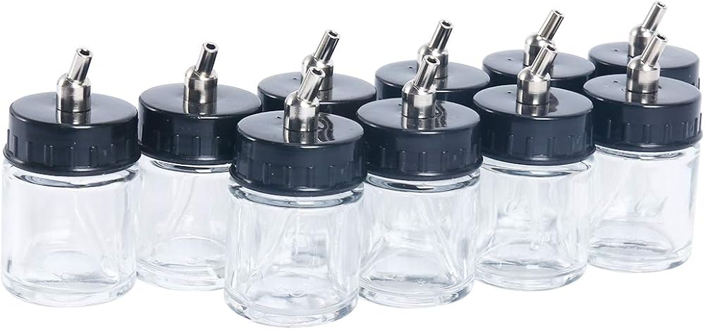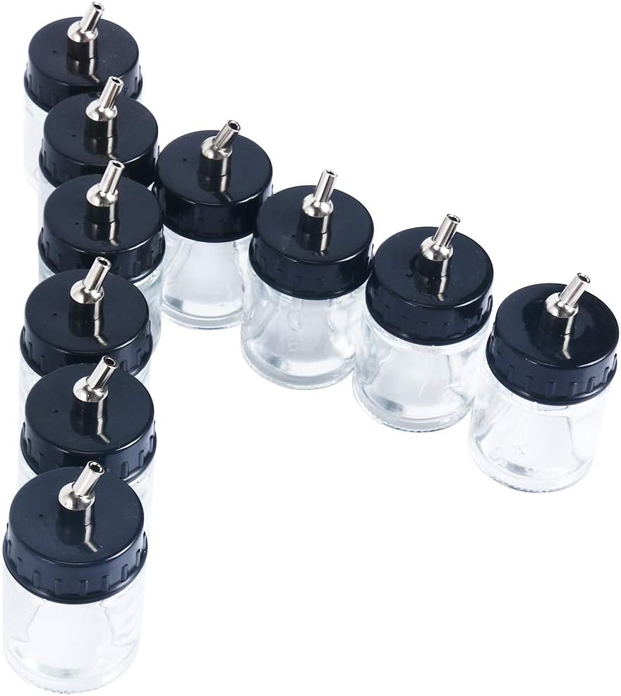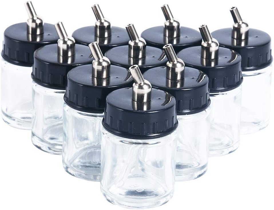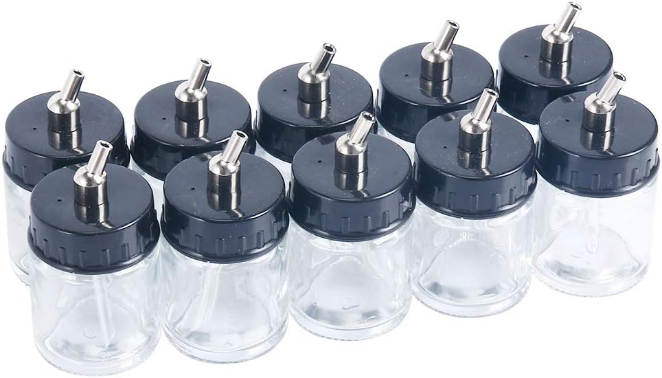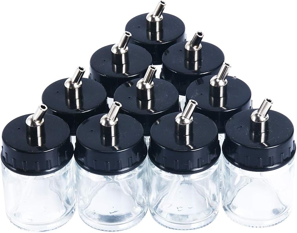 This is a set of 10pcs glass 1.3cu in(22cc) airbrush bottles (siphon feed jars) with adapter lid assembly.