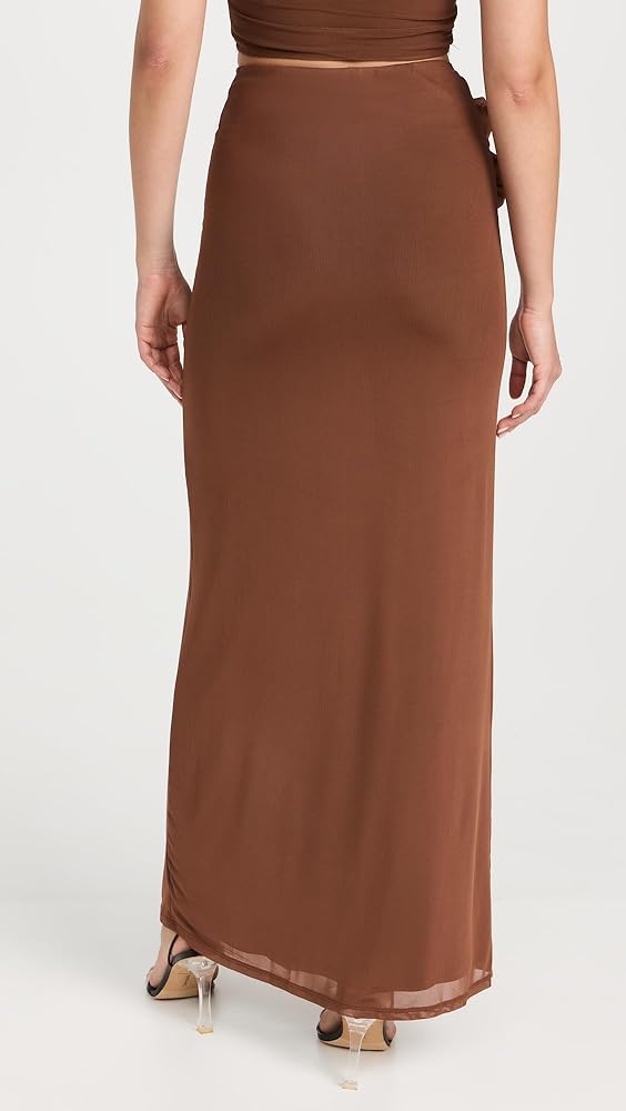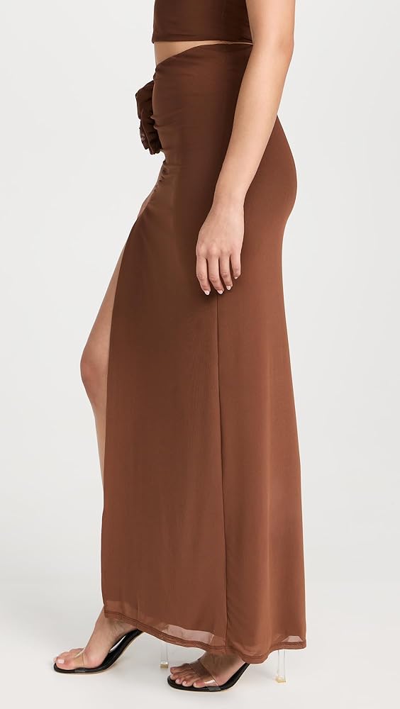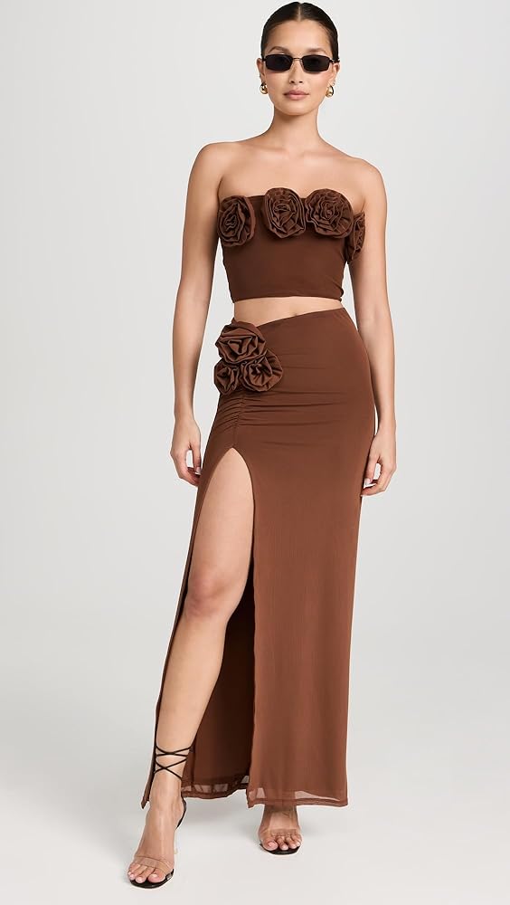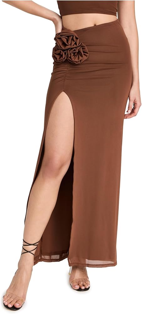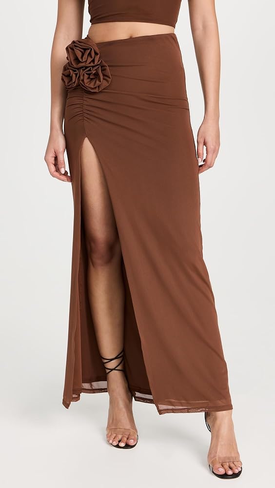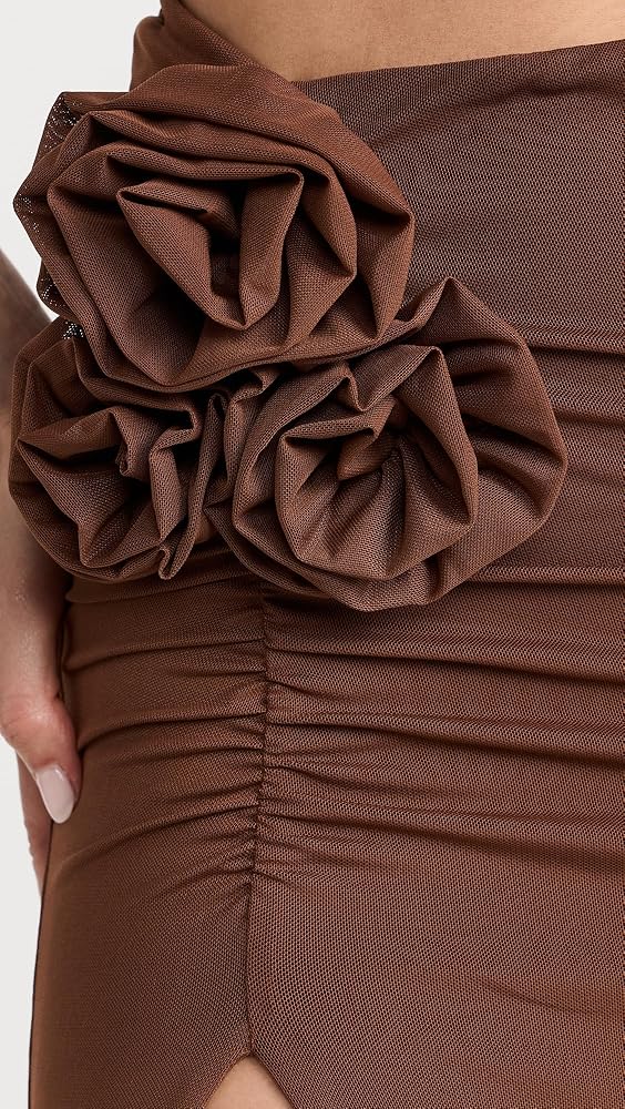 - فتحة جانبية عالية الفخذ، وورود عند الخصر المكشكش