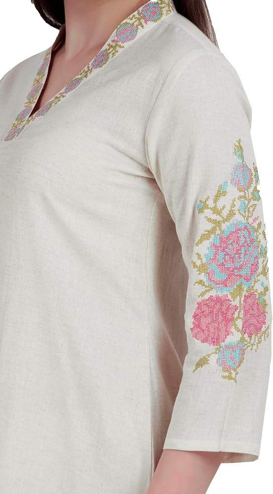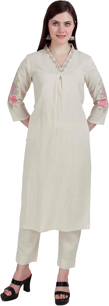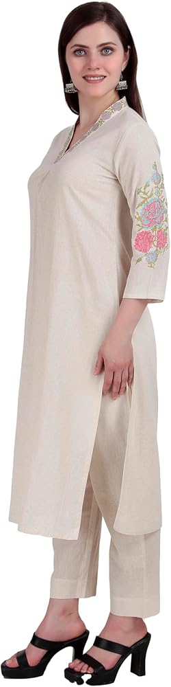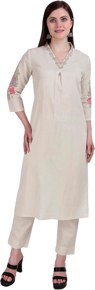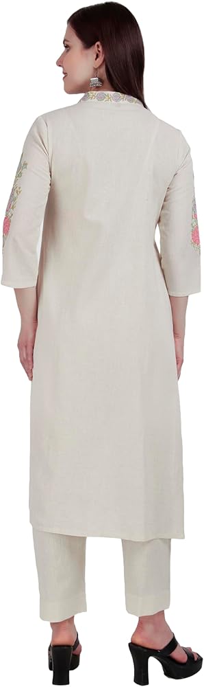 Kurta Top : Made from 100% cotton flax plain fabric with beautiful embroidery along with mirror work on the neck and sleeves.| Stylish Kurta pattern with tassels as shown in the picture. |Length:43-44 inches | Sleeves: Long 17 inches with cut and embroidery work | This outfit comes without lining attached