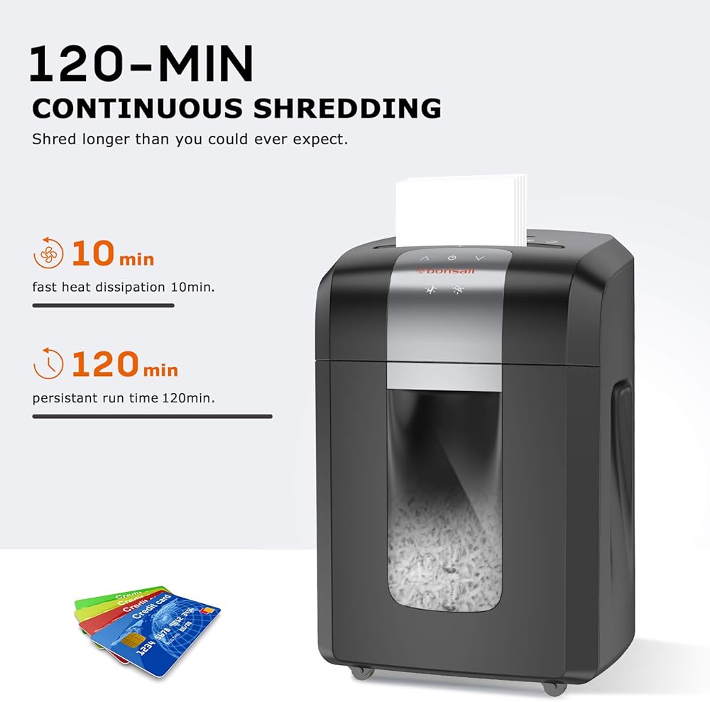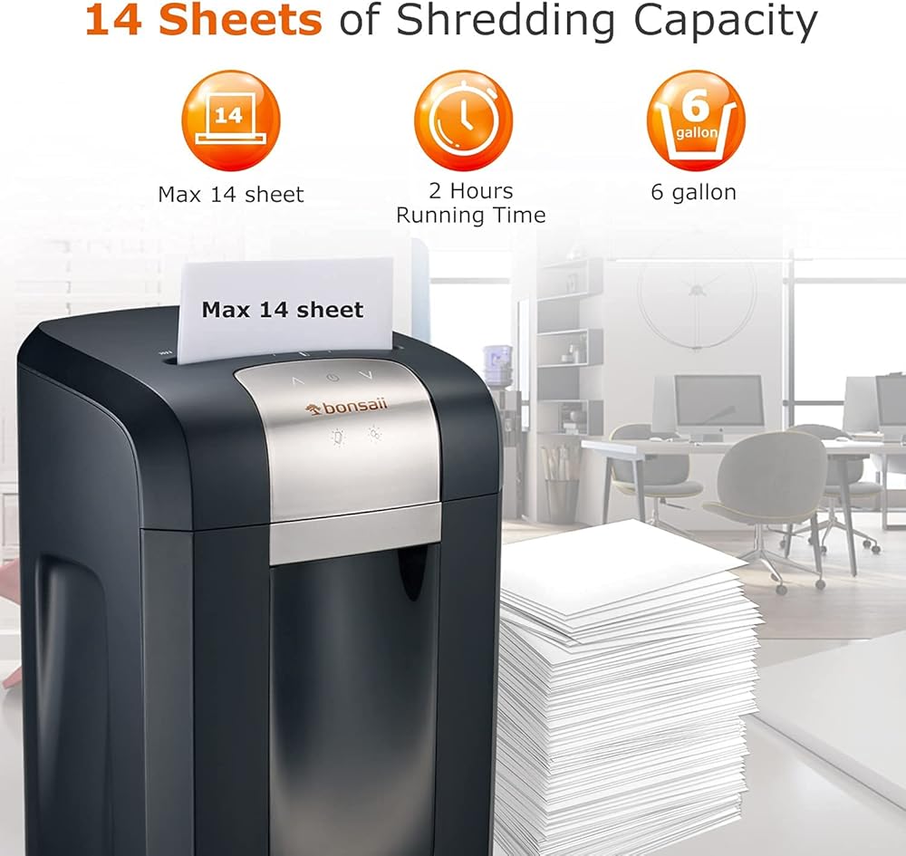 آلة تقطيع الورق Bonsaii P-4، وقت تشغيل 120 دقيقة، آلة تمزيق بطاقات الائتمان المضغوطة شديدة التحمل 14 ورقة للمكتب مع سلة قابلة للسحب سعة 6 جالون و4 عجلات، آلة تقطيع المستندات للاستخدام المنزلي، 3S23