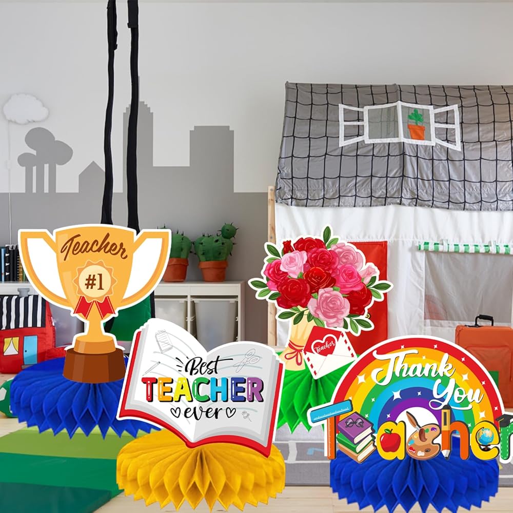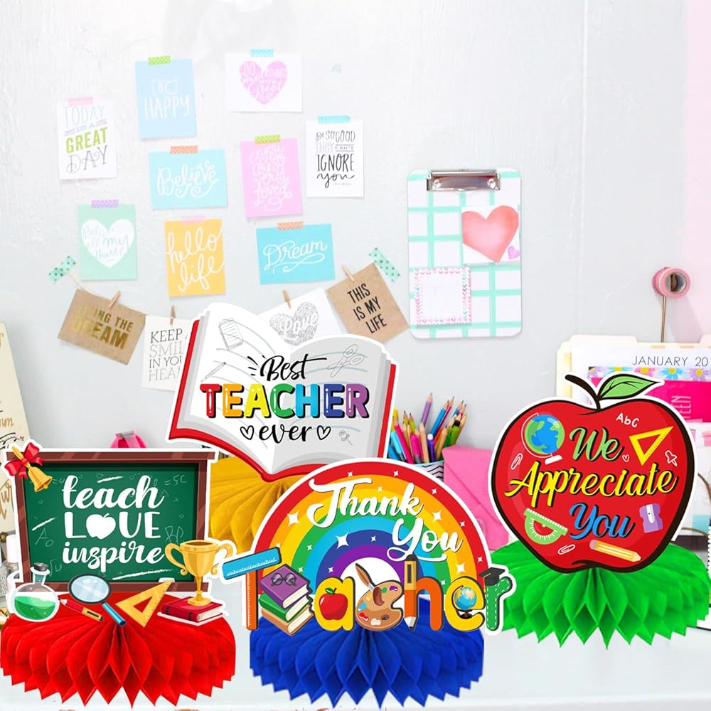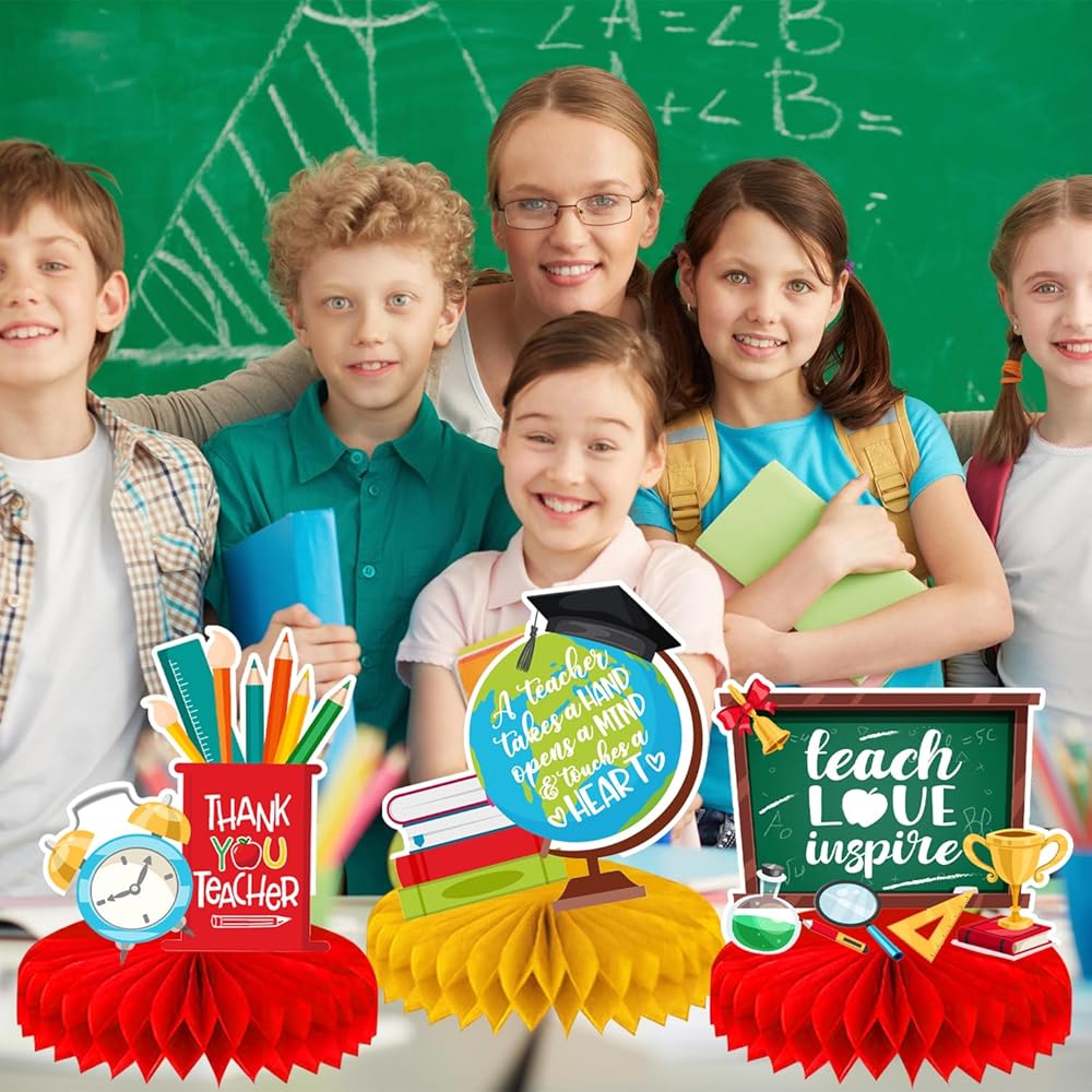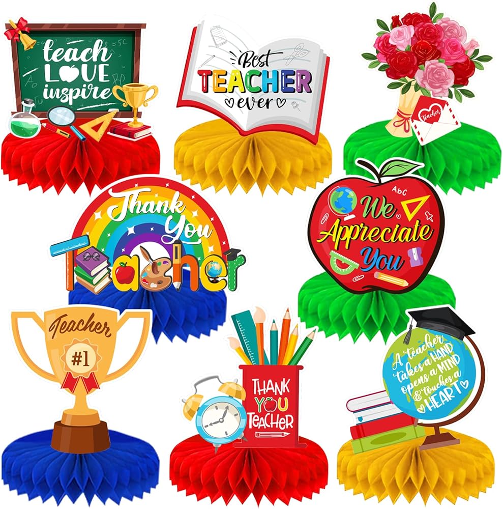 • Unique Design for Teacher Appreciation decorations:Looking for a fun and creative decorations to make your Teacher Appreciation Week party a hit? Our teacher appreciation decorations Honeycomb Centerpieces, each with a different style, feature classic class themes such as books, flowers, blackboard and more, and are printed with "best teacher ever", "thank you teacher" to express appreciation for the teacher. Our teacher appreciation decorations honeycomb centrepieces fit the theme and are vibrant enough to catch the attention of guests.