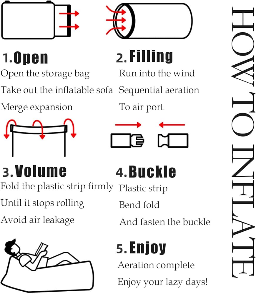 【النفخ بسهولة وسرعة】 لا تتطلب كراسي الاسترخاء الخارجية القابلة للنفخ مضخة هواء، فقط افتح جيب الاسترخاء الخارجي القابل للنفخ تحت الرياح العاتية واركض ضد الريح لالتقاط الهواء أو رفع الفم لأعلى 2-3 مرات. إذا كنت في المنزل أو تحت رياح صغيرة، استخدم مروحة للنفخ أو الجري بسرعة لالتقاط الهواء. أغلق الجيب ولفه بإحكام في أسرع وقت ممكن حتى لا يمكن لفه مرة أخرى، ثم قم بلف الحواف للداخل، ثم قم بإبزيم الحزام وستكون جاهزًا! تحتاج إلى بعض المهارة والصبر!