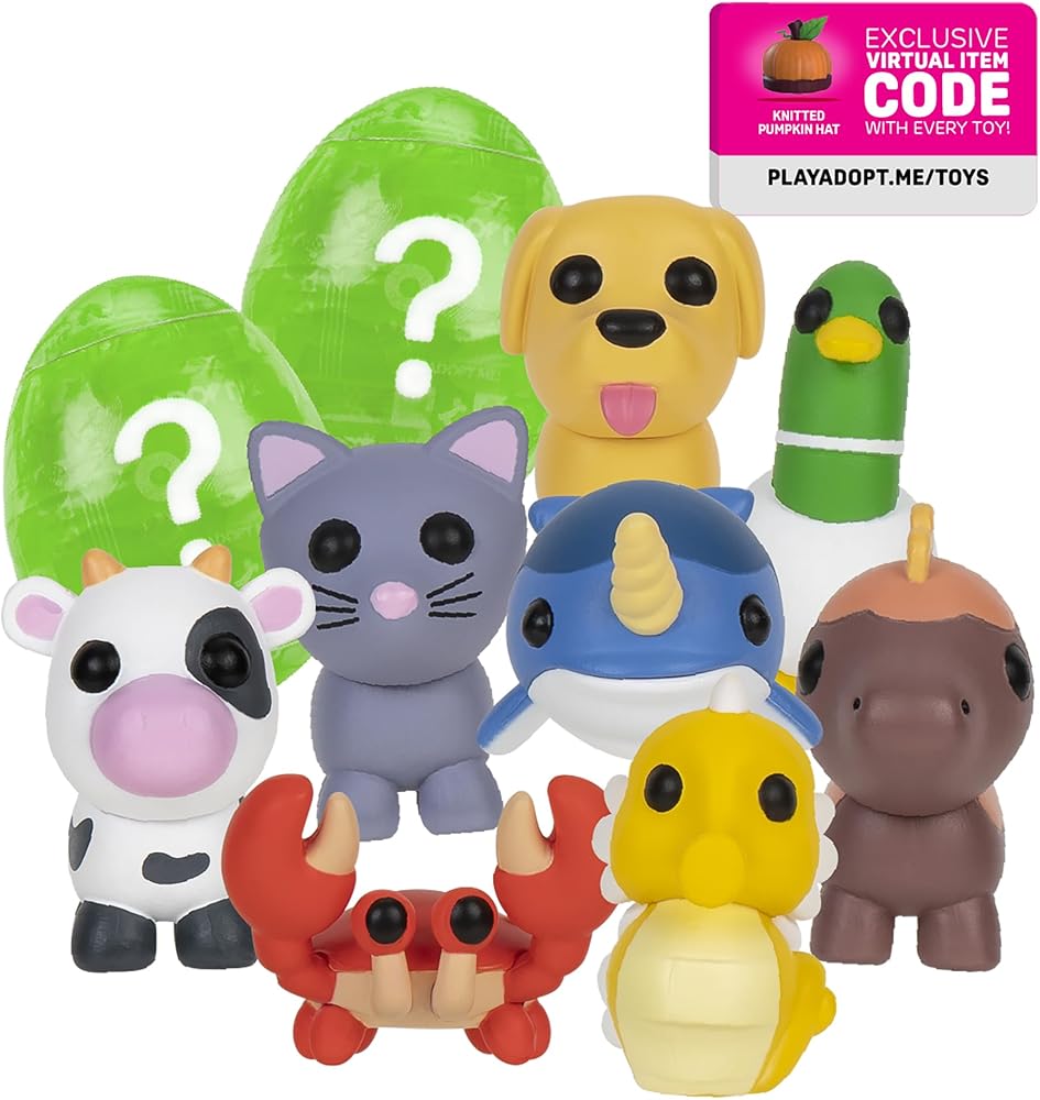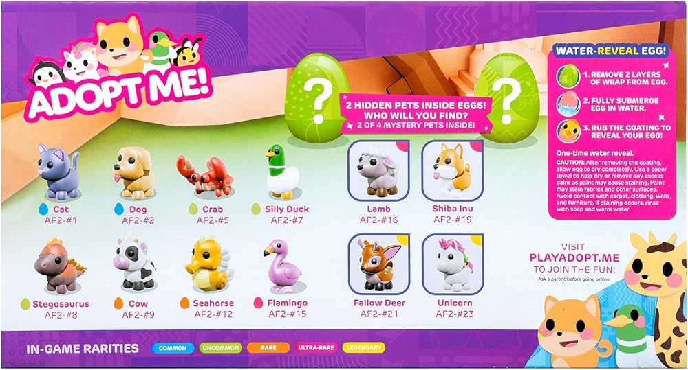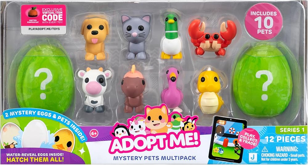 Bring to life the highly desirable and sought-after pets from the popular online game, Adopt Me! Open the box to reveal eight pets ranging in rarity from uncommon to legendary. As a bonus, unwrap the two eggs, submerge them in water to remove the outer coating, and reveal one of the egg styles from the game. Each themed egg contains a 2” plastic Mystery Pet. There are 10 pets to collect in series two, including the Bullfrog, Chick, Blue Dog, Black Panther, Tanuki, Red Fox, Pig, Business Monkey, and two hidden pets! Each Mystery Pet comes straight from your favorite online game and, as a bonus, includes an exclusive Virtual Item Code and a collector's guide. The pets range in rarity from uncommon to legendary, just like in the game, and are perfect for playing, displaying, and trading. Collect them all!