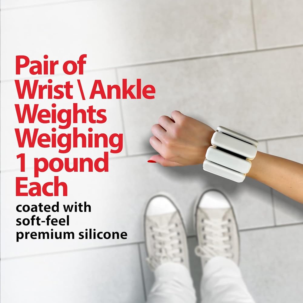 Pair of wrist & ankle weights. Each dumbbell weighs 1 pound and comprises 8 steel blocks coated with soft-feel premium silicone.