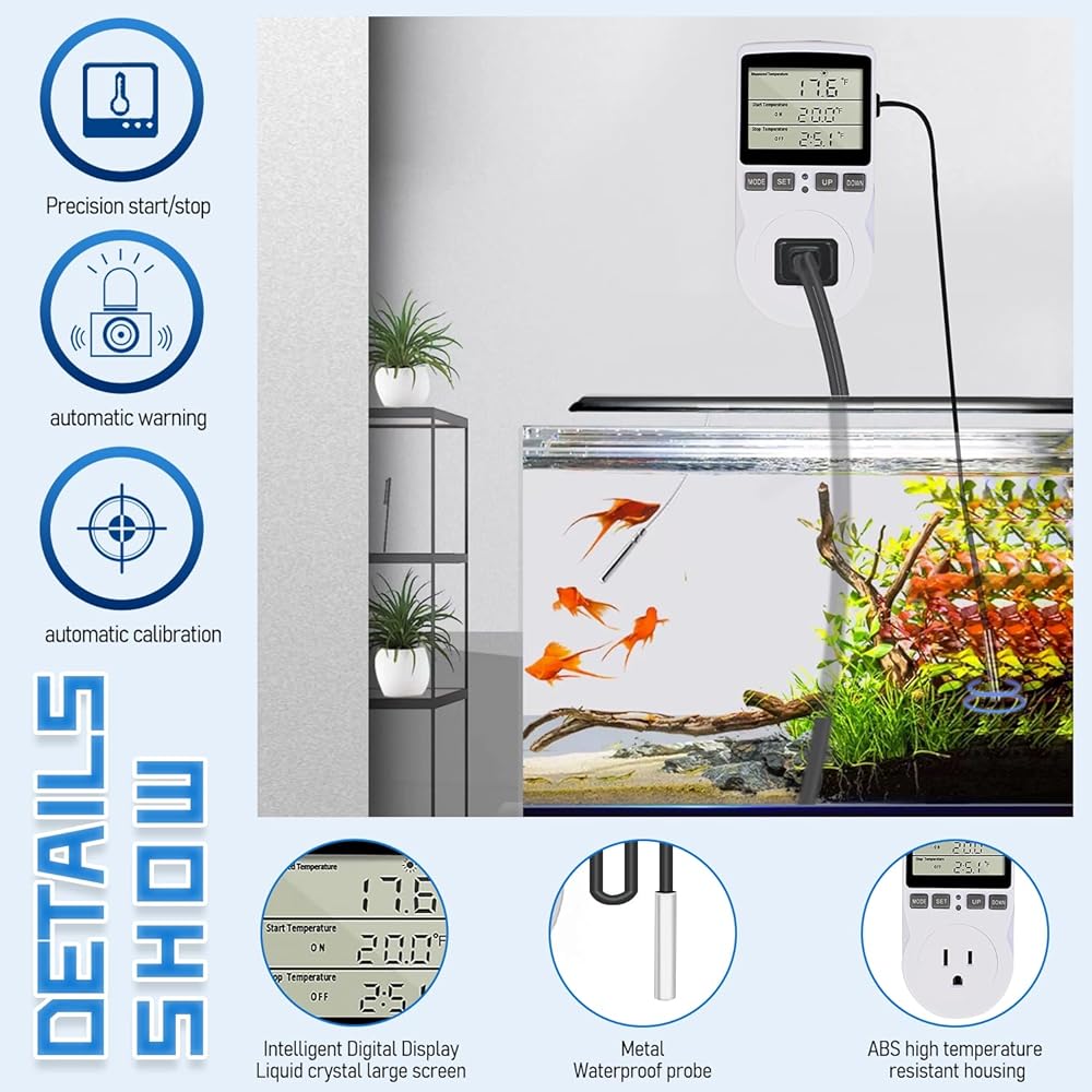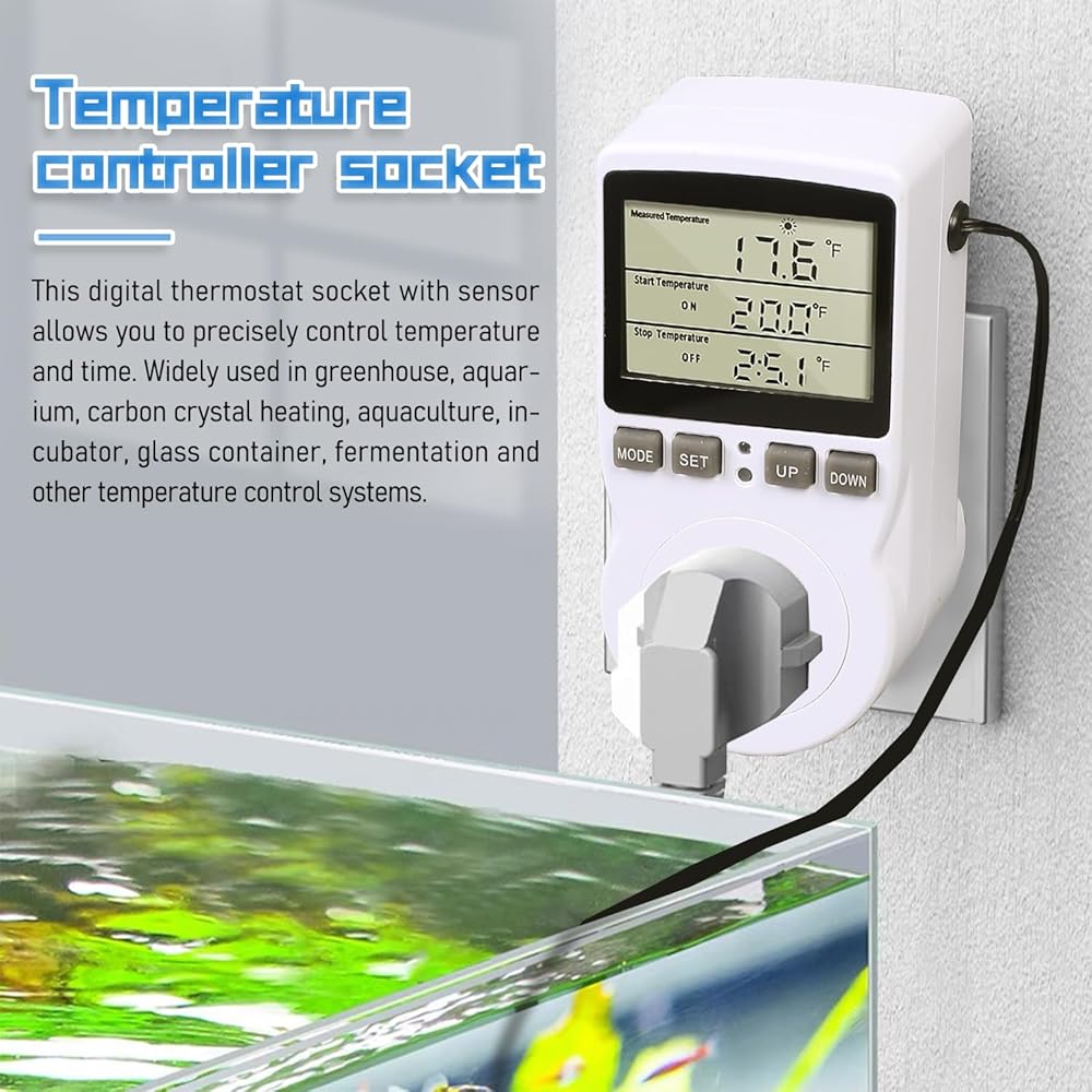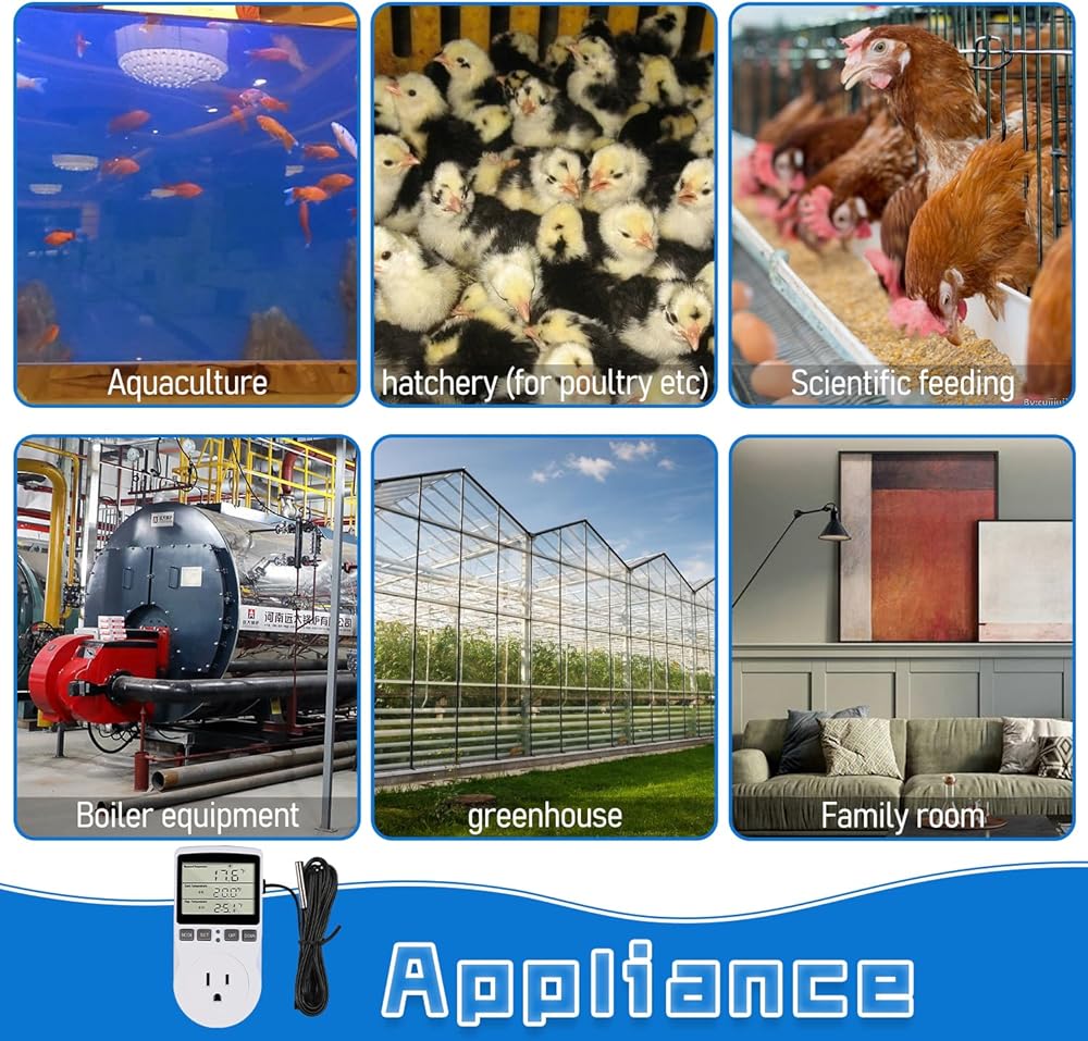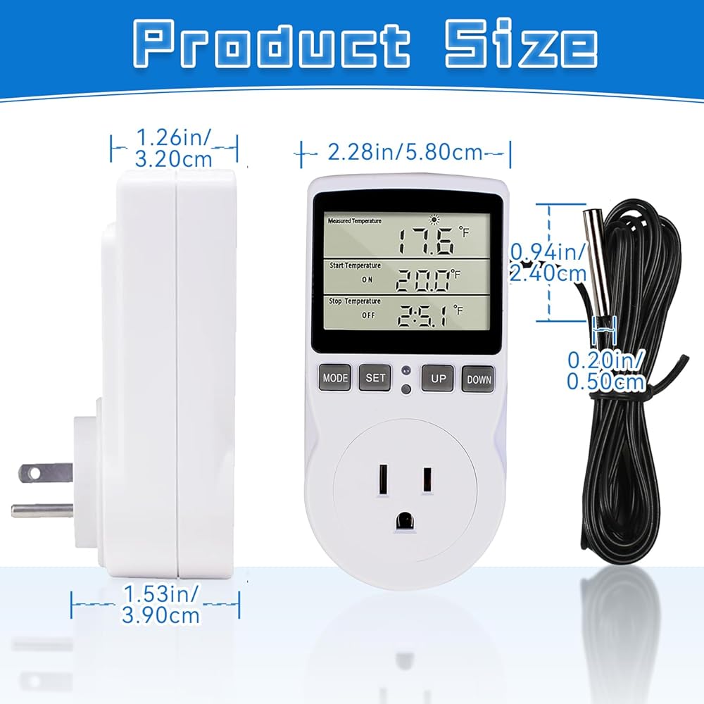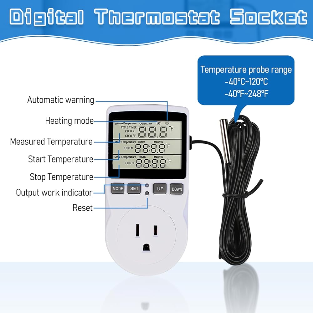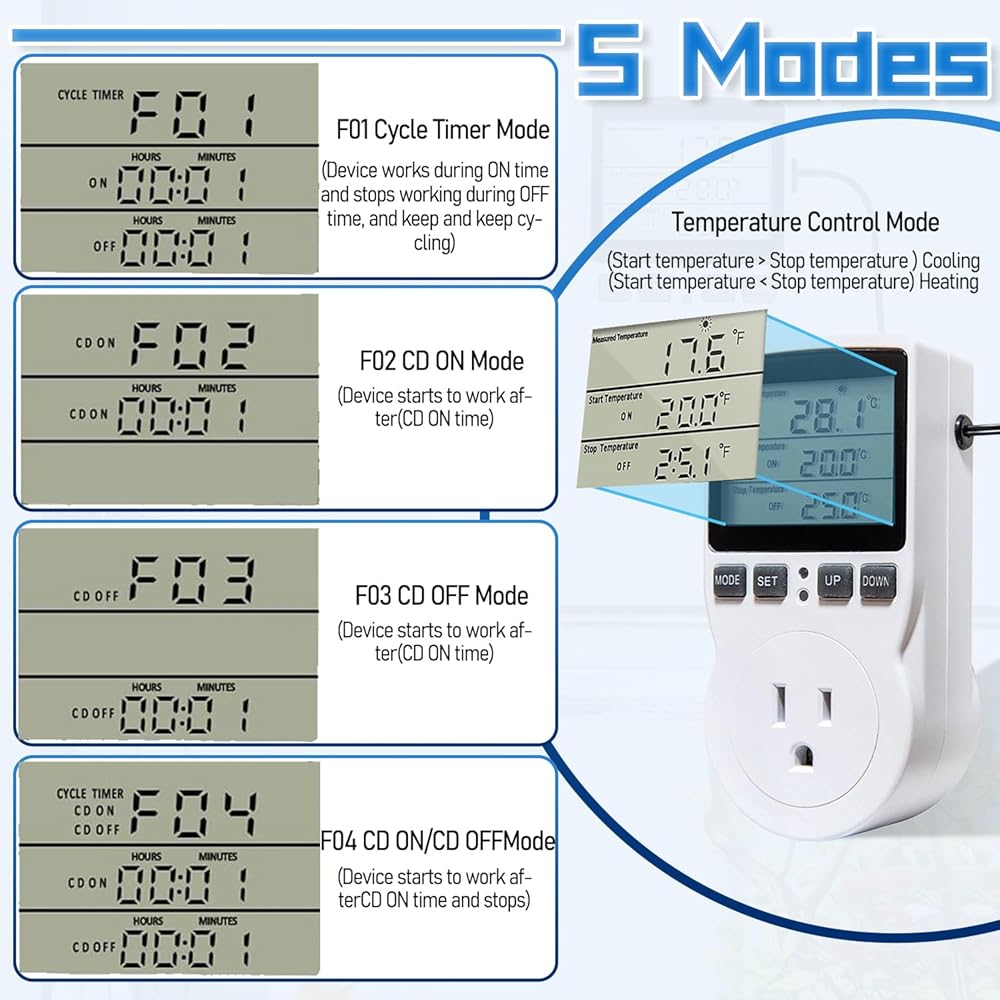 【Versatile Functions】With 5 modes to choose from, including cycle timing control, countdown on/off, and timing switching, this thermostat plug is perfect for a wide range of applications, such as greenhouse, reptile, incubator, terrarium, freezer, refrigerator, heater, homebrew, and more.