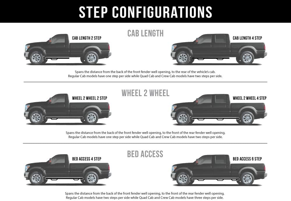Trend-setting Nerf Step in the Wheel 2 Wheel Configuration are built with a 3" Main tube that fits tight to the body with steps positioned at each door that allows the ultimate access for all passengers on stock or lifted vehicles