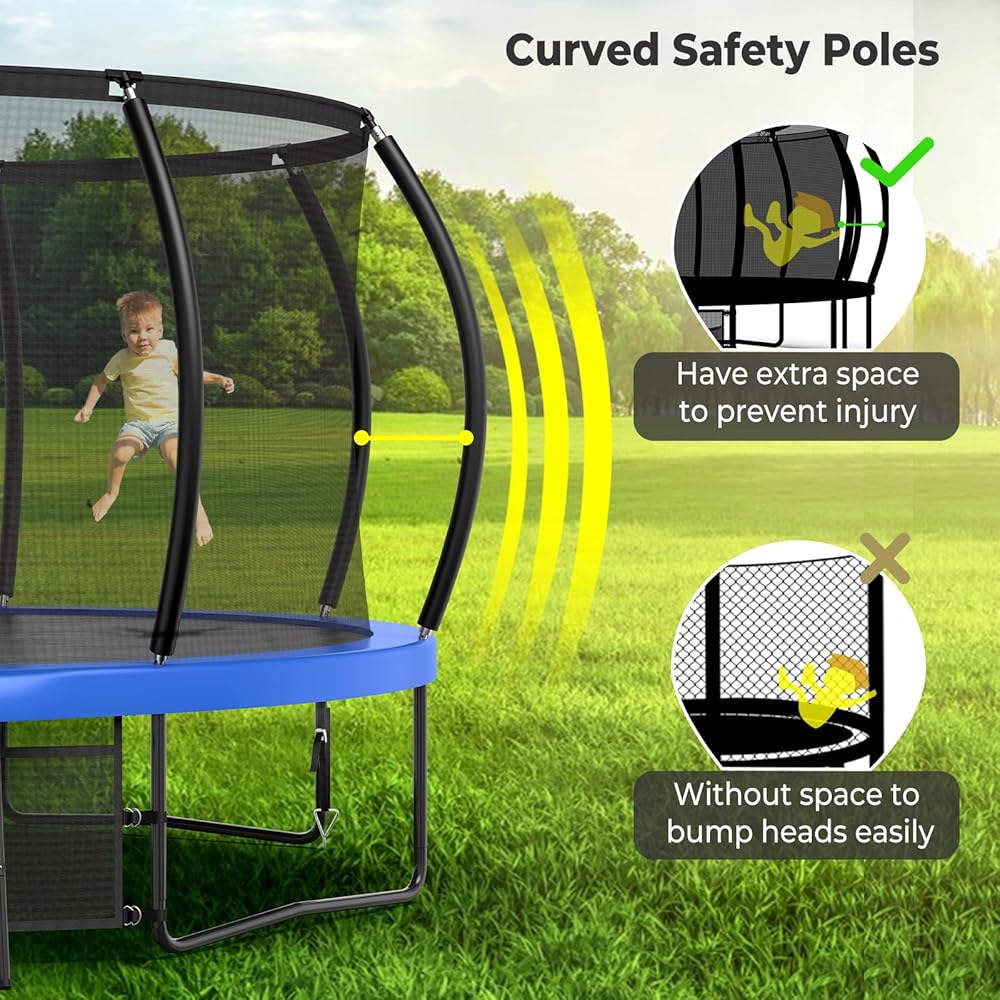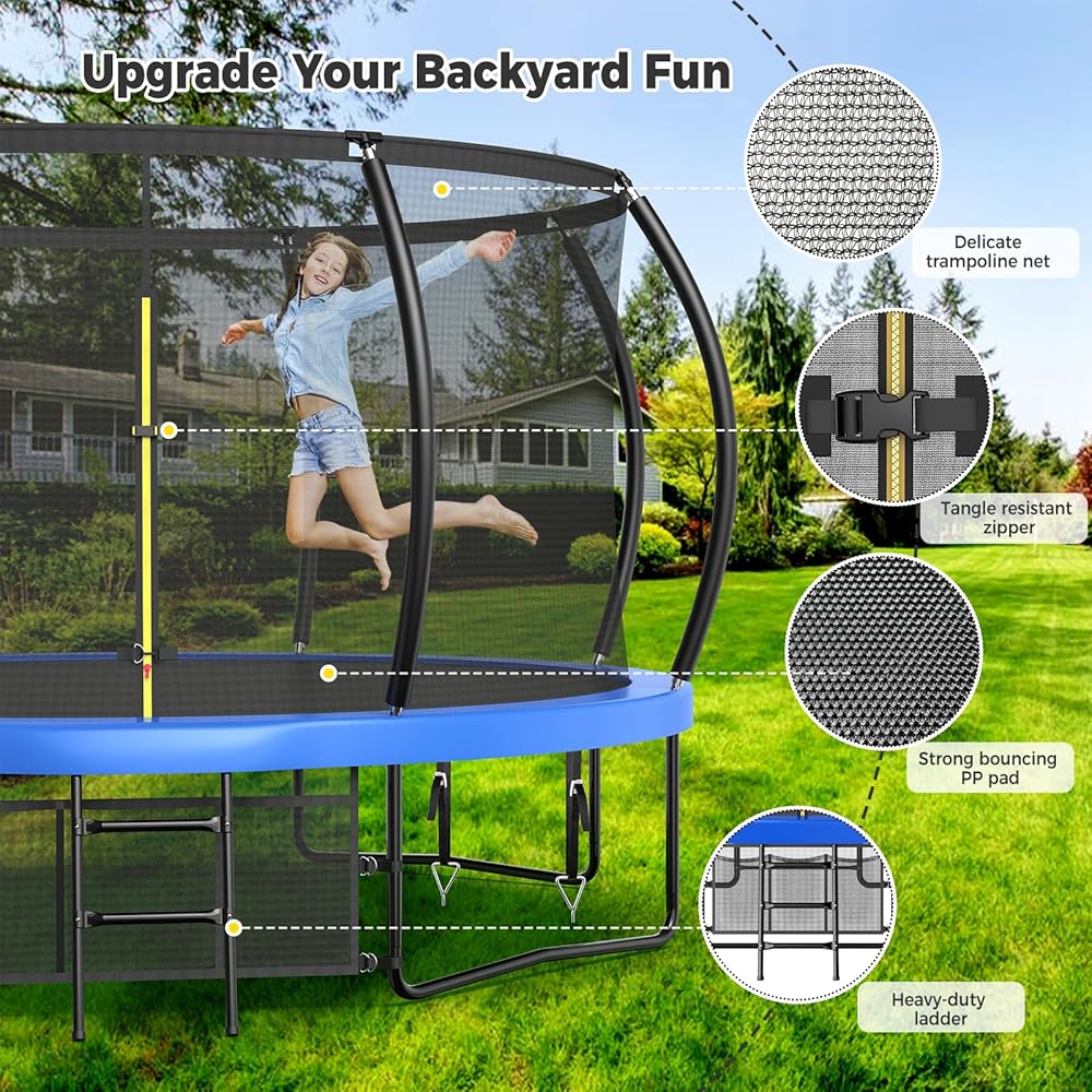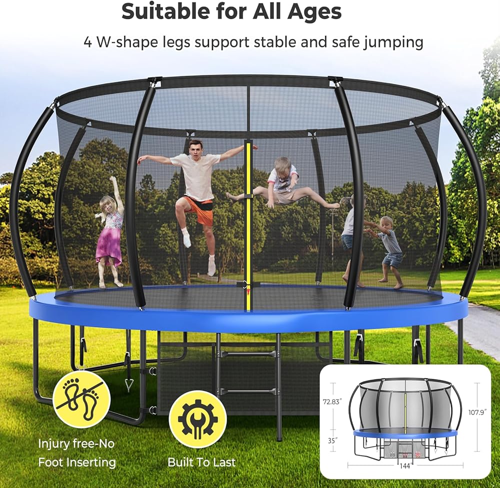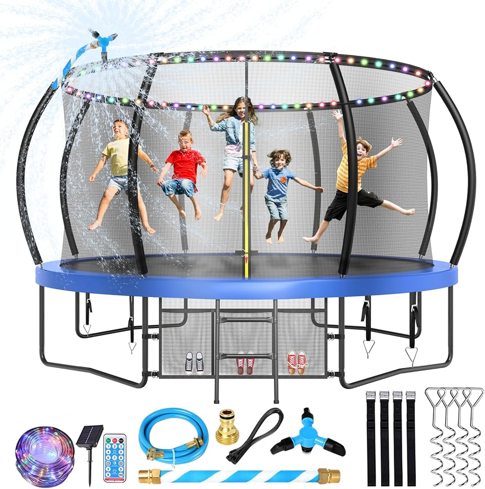 【ملابس إكسسوارات الترامبولين】يأتي الترامبولين بطول 12 قدمًا مع مجموعة كاملة من الملحقات التي تشمل: 4 أوتاد أرضية، 1 رشاش ترامبولين، 1 مصباح LED. حزمة المكافآت تجلب لأطفالك ضحكات لا نهاية لها