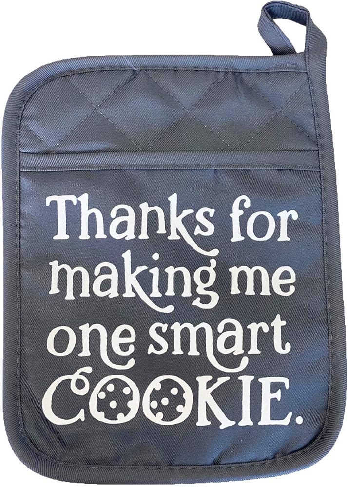 This beautiful gray pot holder is screen printed for lasting quality. This makes the perfect gift paired with a package of cookies and a whisk for any educator or teacher. These are 7 inches wide by 9 inches tall. Cookie mix and whisk are NOT included.