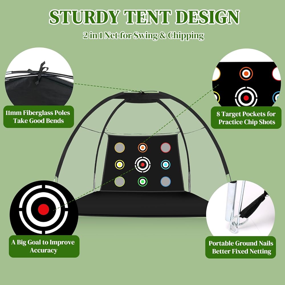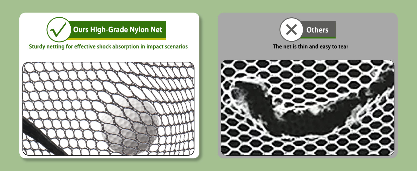 【ثبات وأمان معززان】توفر شبكات ضرب الجولف الخاصة بنا المزودة بـ 4 أوتاد أرضية الثبات أثناء جلسات التدريب، وتمنع الحركة أو الانقلاب، بينما توفر القمصان المطاطية على شكل حرف T وحصيرة الجولف سطحًا آمنًا ومستويًا لضرب الكرة بشكل متسق.