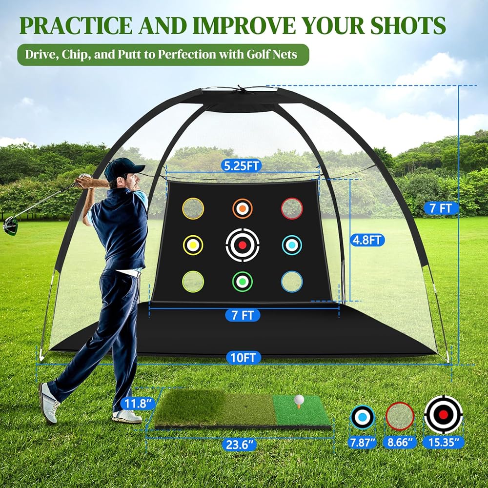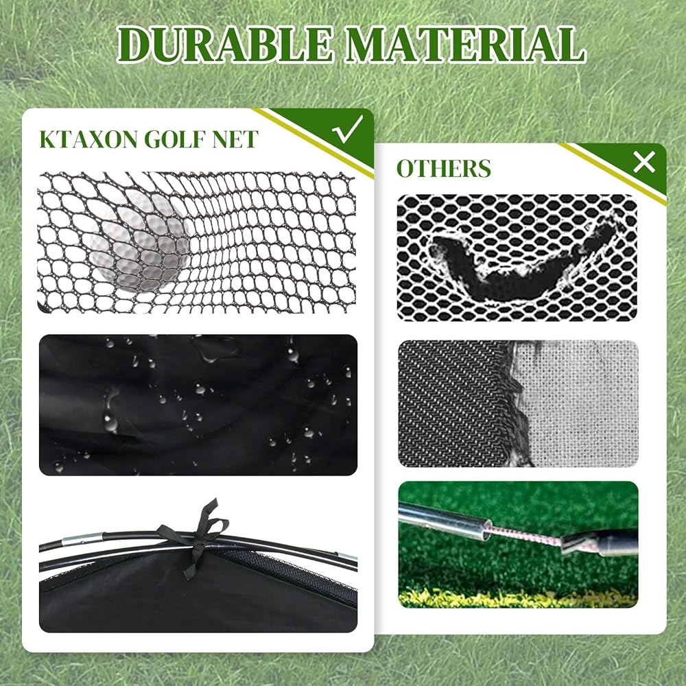 【بناء متين】تتميز شبكة الجولف السوداء مقاس 10 × 7 أقدام بنسيج أكسفورد بوليستر 300D عالي الجودة وإطار عمود من الألياف الزجاجية مقاس 11 مم، مما يضمن المتانة والمرونة ضد اللقطات القوية وعناصر الطقس والاستخدام لفترة طويلة.