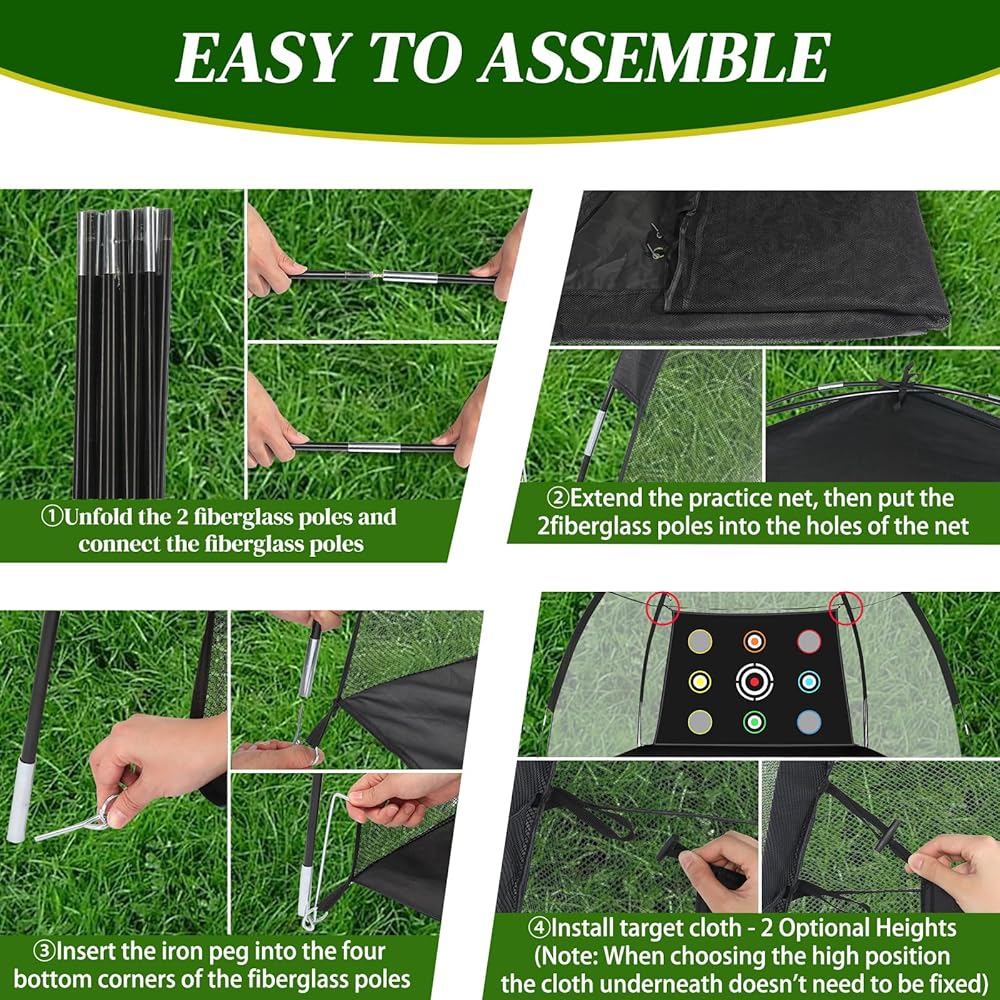 【سهولة التجميع والنقل】يسمح إطار العمود المصنوع من الألياف الزجاجية خفيف الوزن والمتين بالتجميع السهل والسريع. علاوة على ذلك، فإن تضمين حقيبة حمل محمولة يجعل من السهل نقل المجموعة بأكملها إلى مواقع مختلفة، سواء كنت تمارس الرياضة في الفناء الخلفي أو في نطاق القيادة أو في رحلة جولف.