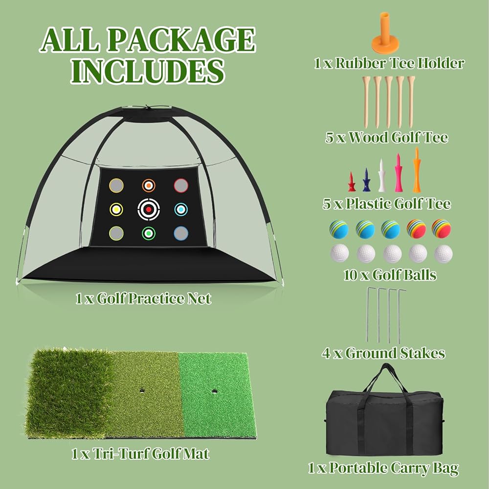 【مجموعة كاملة لممارسة الجولف】تتضمن هذه العبوة كل ما تحتاجه للحصول على تجربة شاملة لممارسة الجولف، وتتميز بشبكة جولف بها 9 أهداف، و10 كرات جولف، و5 تي شيرتات جولف خشبية، و5 تي شيرتات جولف بلاستيكية، وتي شيرت مطاطي على شكل حرف T، وحقيبة حمل حقيبة و4 أوتاد أرضية وسجادة جولف ثلاثية العشب.