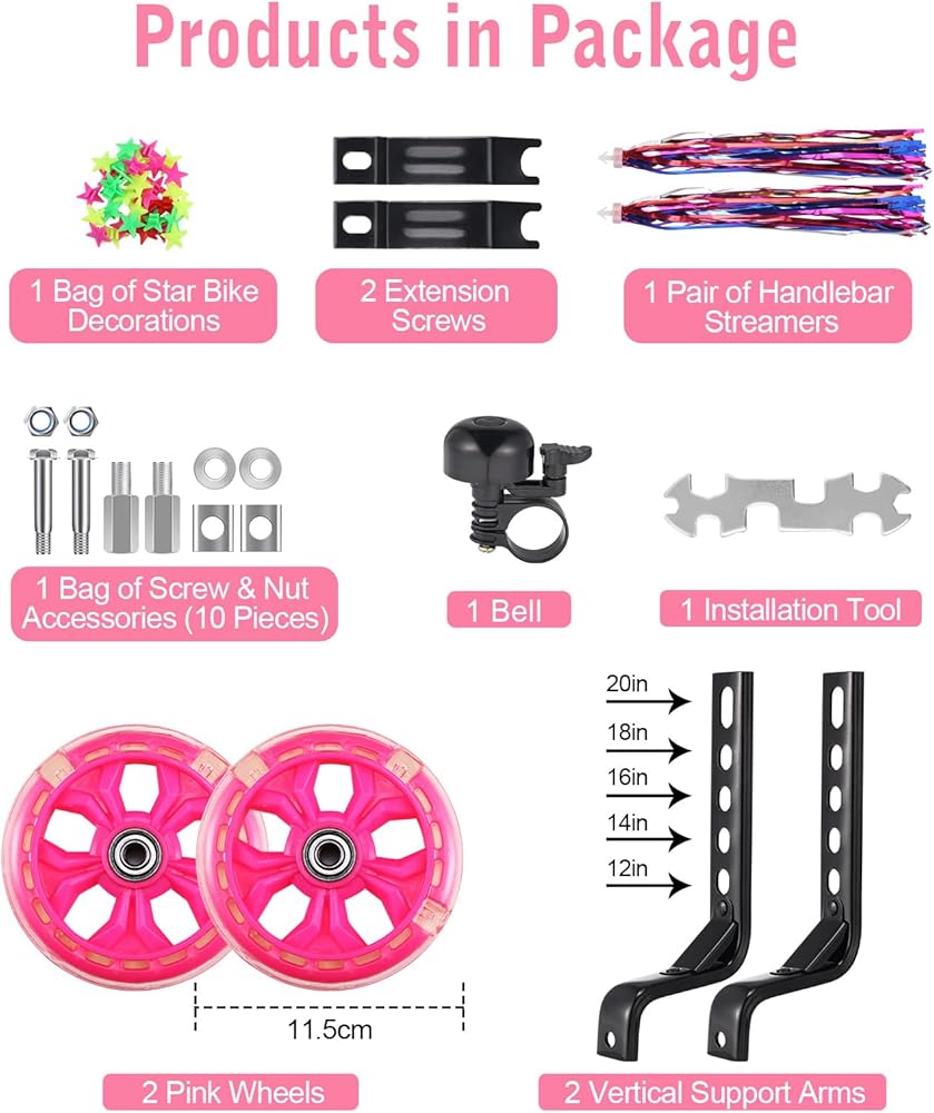 ما ستحصل عليه: زوج واحد من العجلات الوردية، زوج واحد من أذرع الدعامات الرأسية، 1 جرس، 1 حقيبة من البراغي والصواميل (8 قطع)، 1 حقيبة من زينة الدراجة النجمية (36 قطعة)، 1 أداة تثبيت، 2 براغي تمديد وأقواس حديدية، وزوج واحد من أحزمة الرفرفة للمقود
