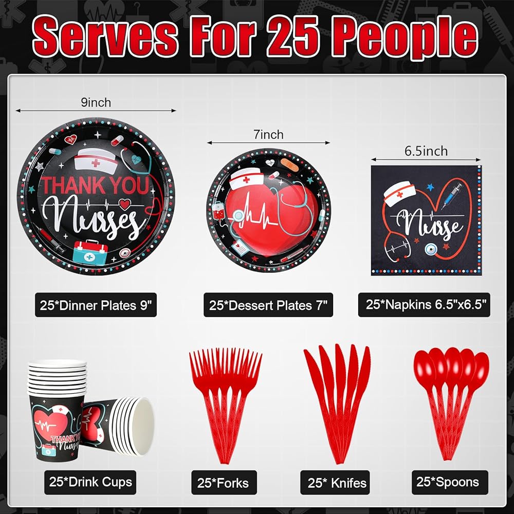 ما يتضمن: تأتي لوازم حفلات الممرضات مع 25 طبق حلوى ورقي (7 بوصات)، 25 طبق عشاء ورقي (9 بوصات)، 25 كوبًا (9 أونصة)، 25 منديلًا مزخرفًا (6.5x6.5 بوصة)، و25 مجموعة من السكاكين، الشوك والملاعق. تضمن هذه الكمية السخية أن لديك ما يكفي من الإمدادات لخدمة ما يصل إلى 25 ضيفًا خلال حفلاتك.