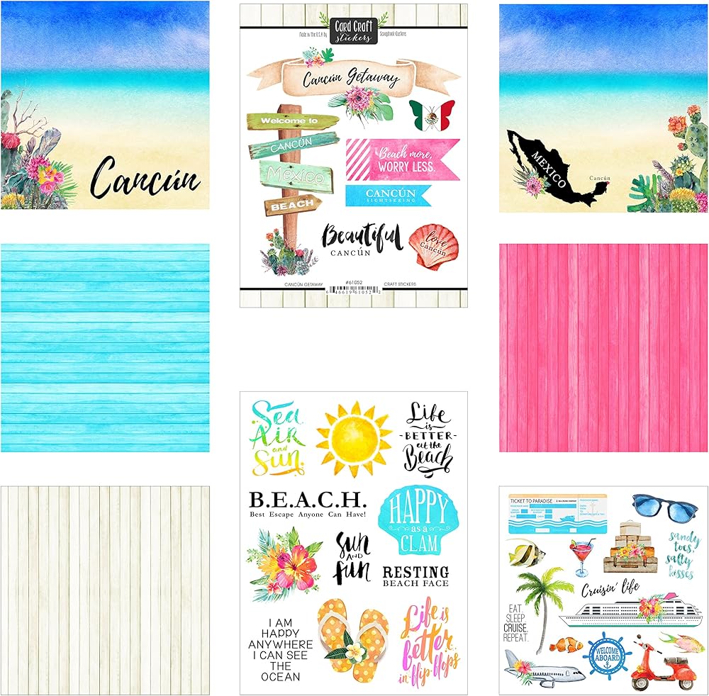 Proudly made in the USA, Scrapbook Customs getaway scrapbook kits are perfect for scrapbooking memories of your tropical destination vacations, or you can decorate handmade cards, invitations, gift bags, and more. Kit includes 5 sheets of 12x12 papers, 2 sticker sheets, and 1 sheet of 12x12 generic paper cut outs. These papers are perfect as a title page to journal your memories. Our papers are made of high quality cardstock that are acid and lignin free.
