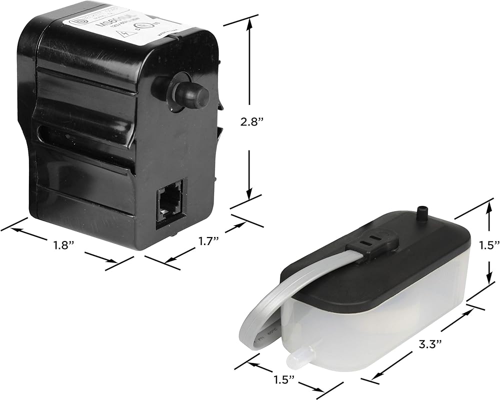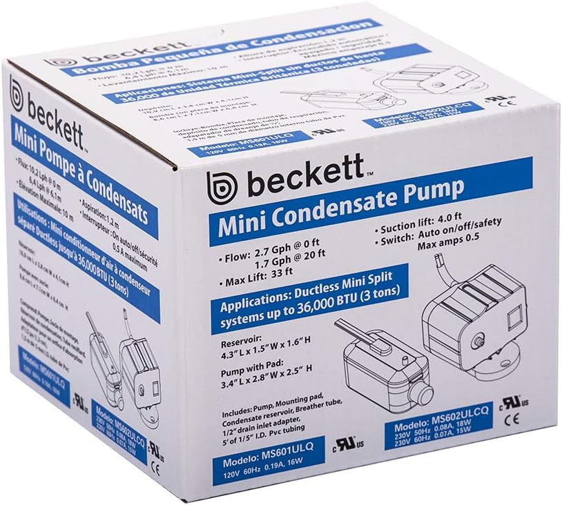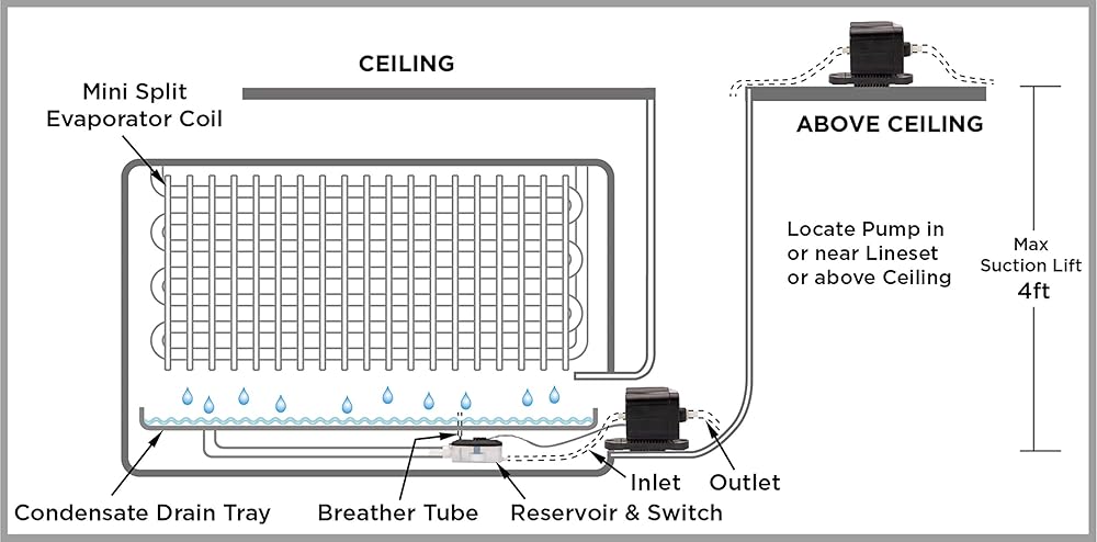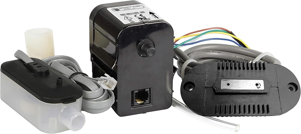 This MS60 Mini Condensate Pump is designed to be installed within Wall, Ceiling Suspended and Floor Mounted Mini-Split and Chilled Water Fan coil Air Conditioning Units with a maximum rating of 36,000 BTU (3-tons). This unit is rated for 50% duty cycle. The Pump consists of 2-parts: Pump Unit and Sump/Detection Unit. The Pump Unit must be installed, preferably in the vertical position, either within the air handling unit, in an adjacent gutter or in the false ceiling above the unit.