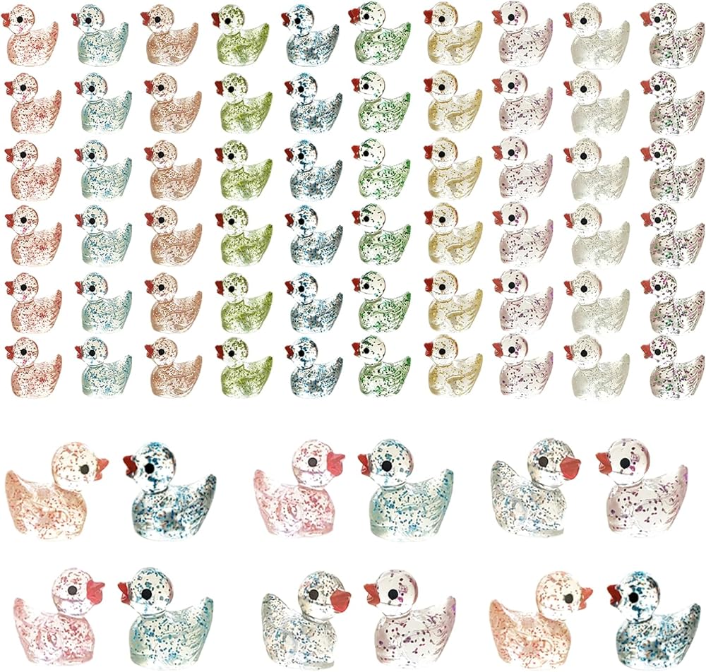 Material: Hard resin Color:10 colors with luminous Size: Approx. 1.8*1.5*1cm Package Include: 60 x luminous tiny resin ducks The glow in the dark little resin duck are realistic and adorable miniature, suitable for DIY crafting, slime, dollhouse, cake, garden, landscape, aquarium decoration, photograph props etc.