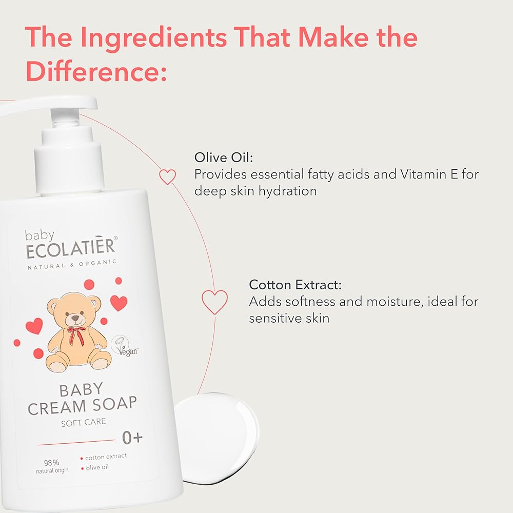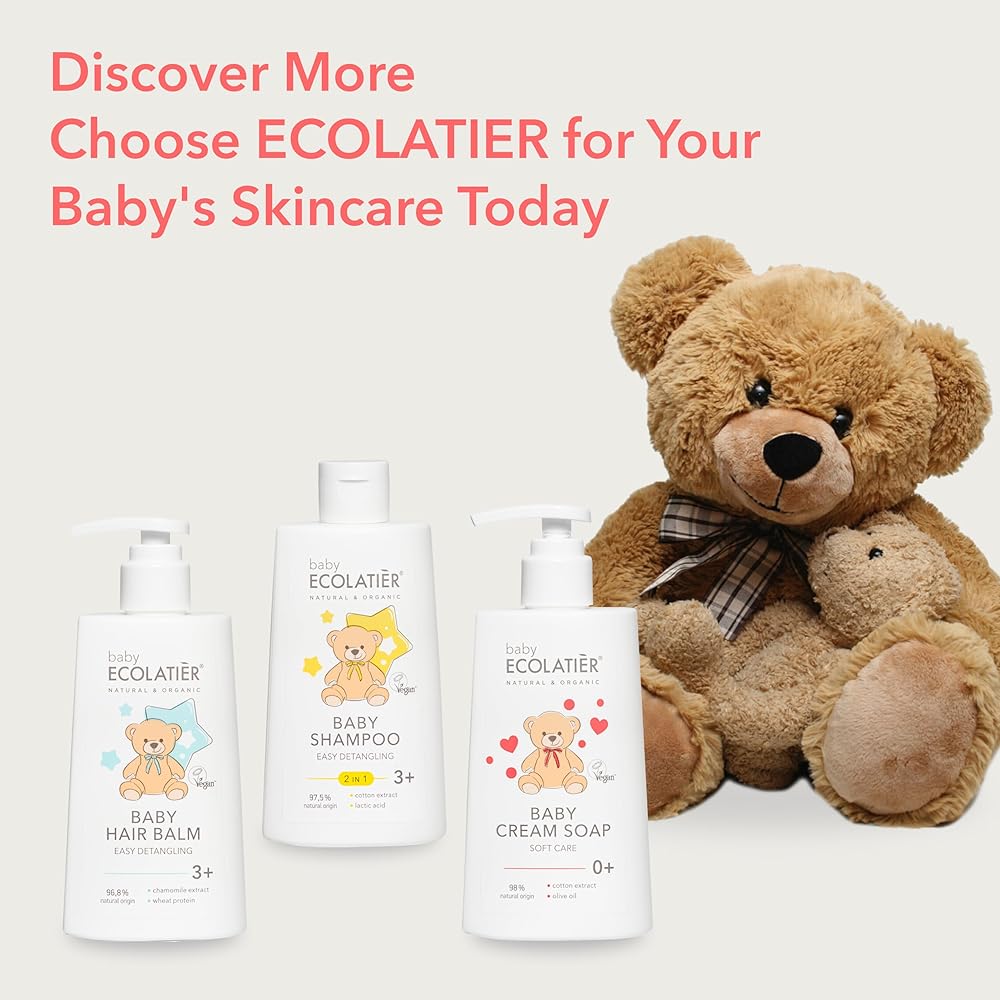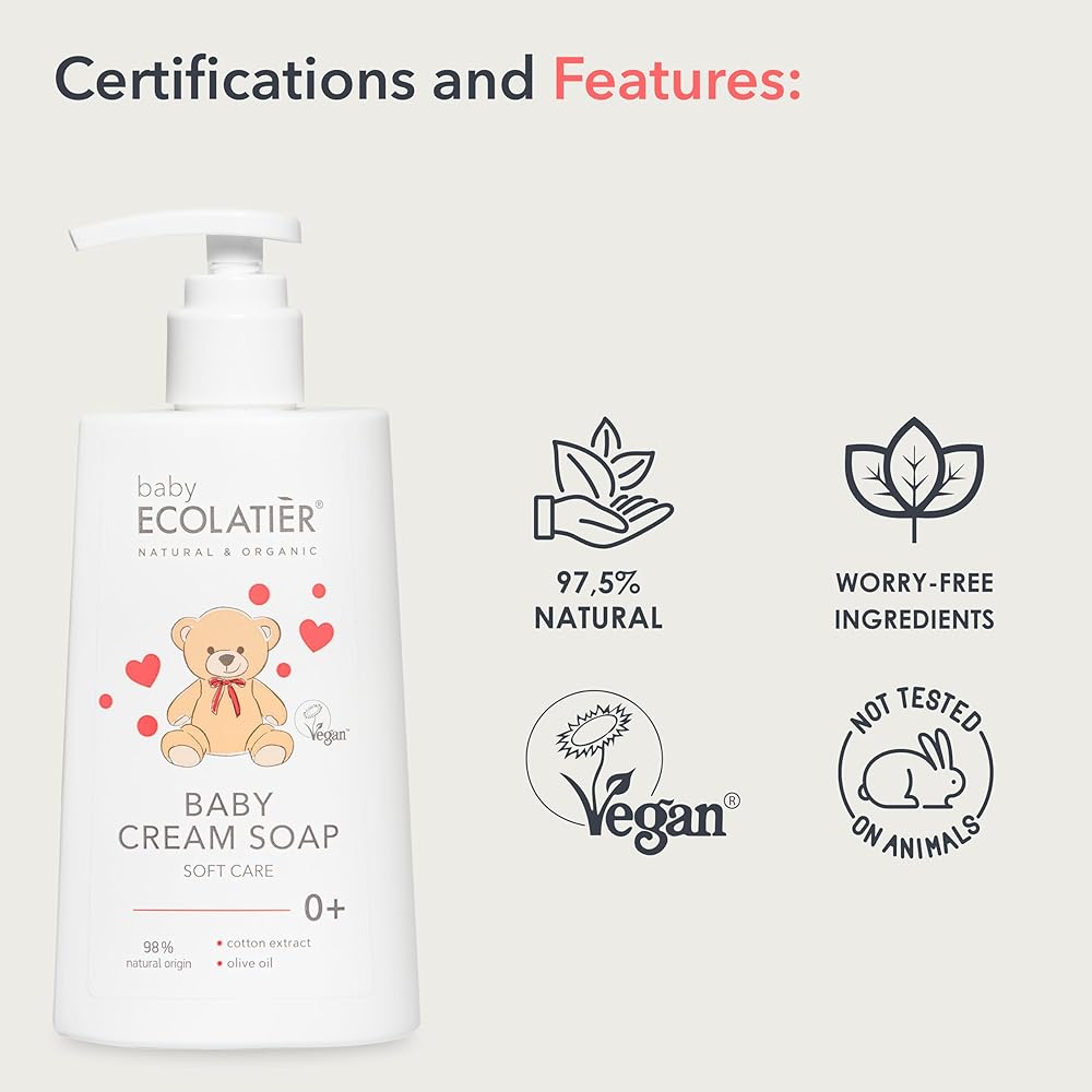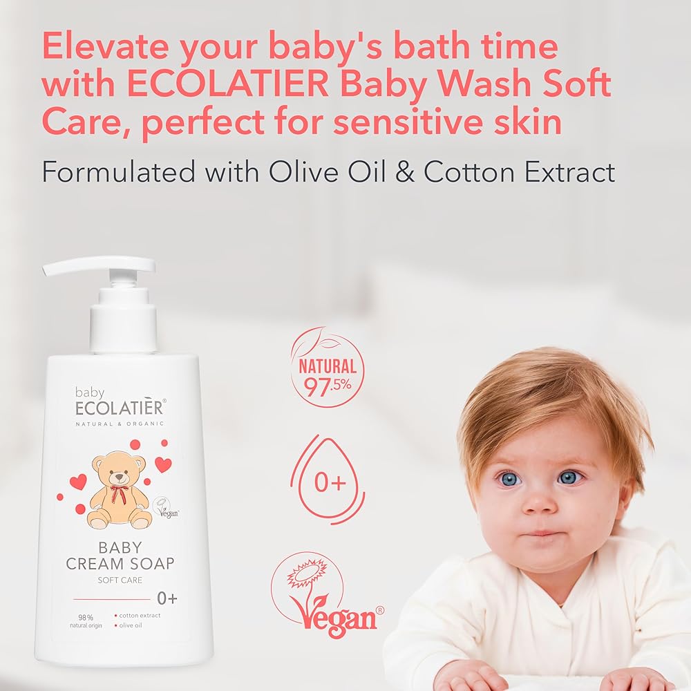Elevate Your Baby's Skincare Start your child's life with the right skincare habits using ECOLATIER kids body wash. Crafted for your little one's delicate skin, our soap provides gentle cleansing and optimal moisturization. What Makes Us Unique Our baby wash is enriched with Olive Oil and Cotton Extract, creating a soft and nourishing cleansing experience. Olive Oil offers essential fatty acids and vitamin E, which deeply hydrate the skin. Cotton Extract adds softness and moisture, making it perfect for sensitive skin. New Formula Highlights Olive Oil intensely moisturizes and nourishes, making the skin extremely soft. Cotton Extract cares for sensitive skin, softening and moisturizing it. All ingredients are worry-free. Purity and Safety With a 98% Natural Origin formula, this honest shampoo and body wash is free from harmful chemicals. It's also Vegan Certified, ensuring it meets and exceeds ethical standards. Quick and Easy to Use For busy parents, this baby soap is a boon. Apply to wet skin, lather, and rinse. Its creamy texture ensures easy application and quick rinsing, saving you time. Your Money's Worth Don't compromise on your child's skincare. Our baby soap offers high-quality care at an affordable price, making it a long-term investment in your child's well-being. Join the Movement By choosing ECOLATIER, you align yourself with a sustainable and ethical lifestyle. Our Vegan Certification is a testament to our commitment. Final Words Don't settle for less. Add this baby wash to your cart today for a superior skincare routine for your child, combining the best of nature and science.