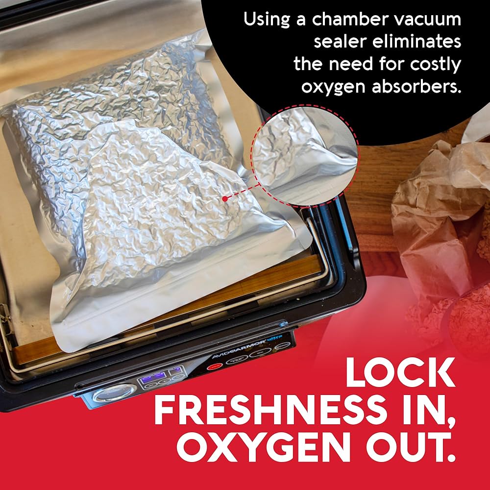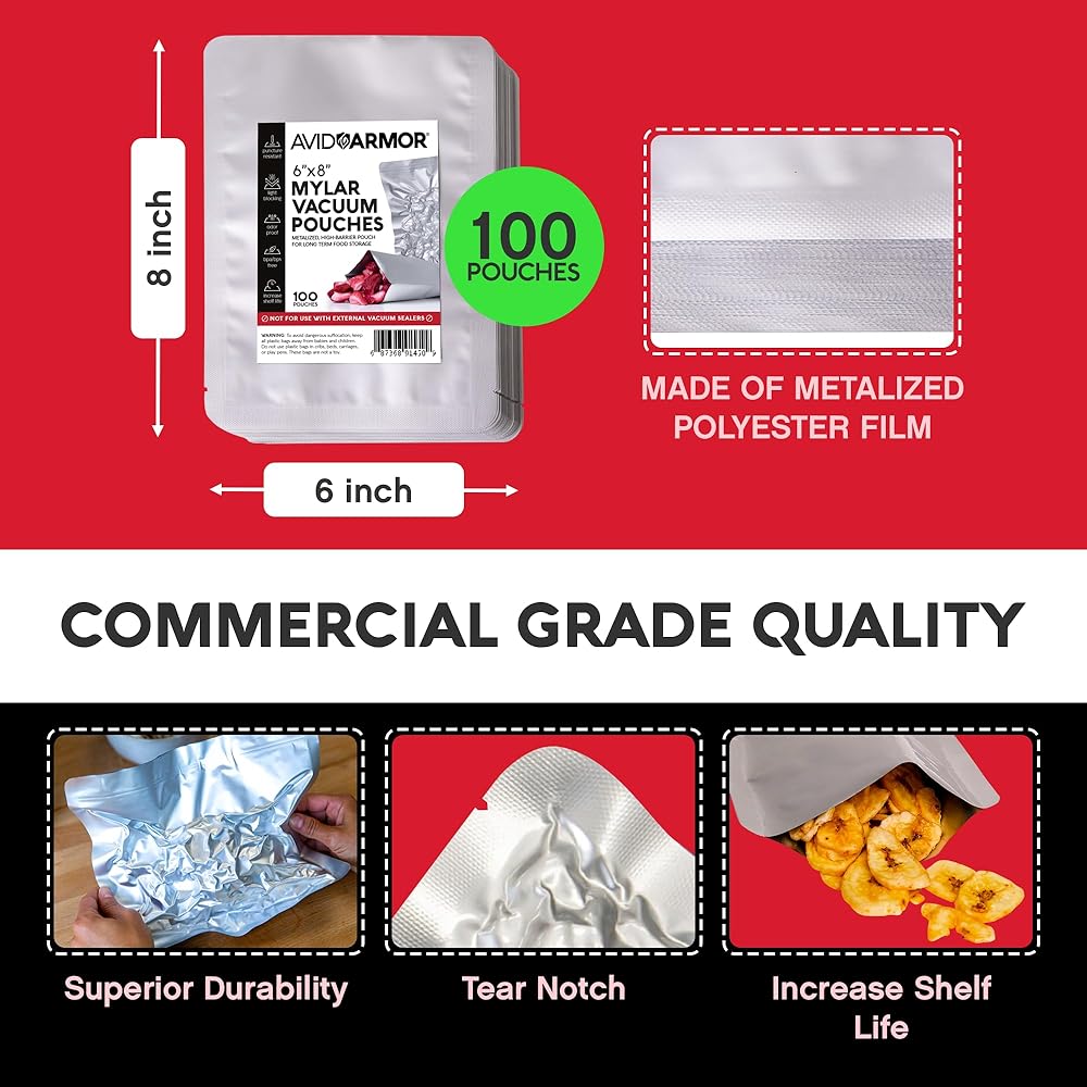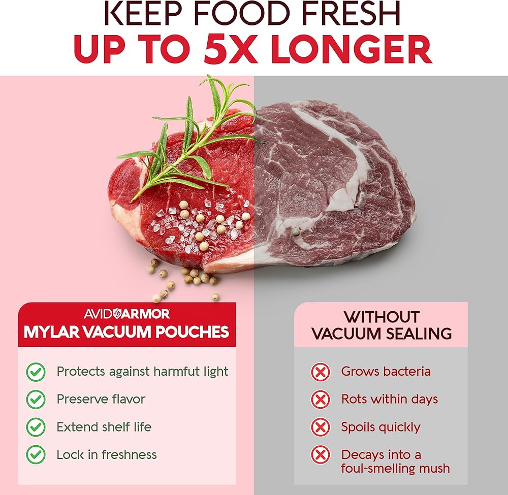 Revolutionize Your Food Preservation with Avid Armor's Cutting-Edge Mylar Chamber Vacuum Pouches! Discover the Next-Level Solution for Long-Lasting Food Storage: Avid Armor's NEW Mylar Chamber Vacuum Pouches. Specifically engineered to complement all Avid Armor chamber vacuum sealers, these innovative pouches provide an unmatched level of security that can extend your food's shelf life for an astonishing 20-30 years! Defend Your Food with our strongest Armor yet. The ultimate blend of poly nylon and metalized foil to shield your food from the harmful effects of light, moisture, oxygen, and odor. Engineered to withstand punctures and prevent bag failure, these exceptional pouches guarantee ultimate protection and extend your food's shelf life for decades. Rest assured, our bags are BPA/BPS free, ensuring your food stays safe and fresh. Unlock the Triple Threat: Save, Preserve, & Prepare Unleash the incredible benefits of vacuum-sealed mylar bags and watch your savings soar! By dramatically reducing food waste, you can potentially save hundreds of dollars every year. Never worry about food shortages again as you plan and store for weeks, months, or even years ahead. Secure your family's future with an ample supply of nourishment. No More Oxygen Absorbers Required! Bid farewell to costly and cumbersome oxygen absorbers. Harnessing the power of advanced vacuum sealing technology, our mylar bags create a permanent airtight seal, effectively eliminating the need for oxygen absorbers. Say hello to hassle-free food storage! Why Mylar? Understanding the Distinction: Mylar vs. Regular Vacuum Seal Pouches. Mylar pouches, made of metalized polyester film, provide excellent barrier properties against moisture, oxygen, and light. They are durable, opaque or metallic in appearance, and commonly used for long-term dry food storage. On the other hand, regular vacuum seal pouches, woven from multilayer plastics, offer an affordable alternative with reliable barrier properties.