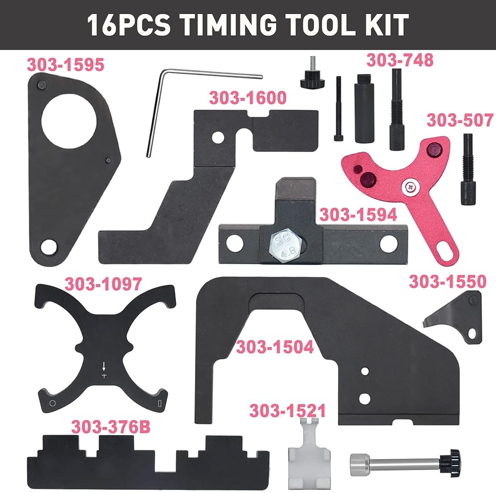 ما تحصل عليه -- 16 قطعة في علبة تخزين: لوحة وأداة محاذاة بكرة العمود المرفقي، لوحة محاذاة عمود الكامات، أداة محاذاة مستشعر الكرنك، دبوس توقيت العمود المرفقي، دبوس الشد، لوحة محاذاة عمود الكامات، وأدوات أخرى.