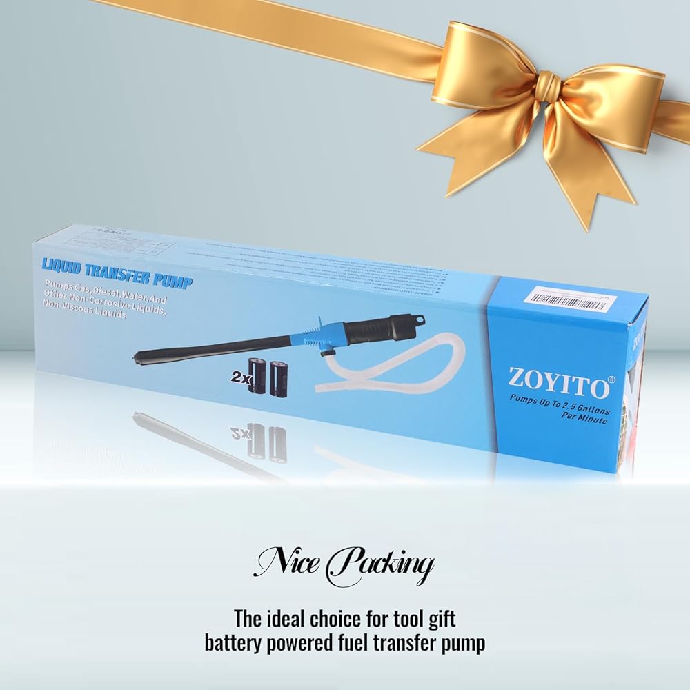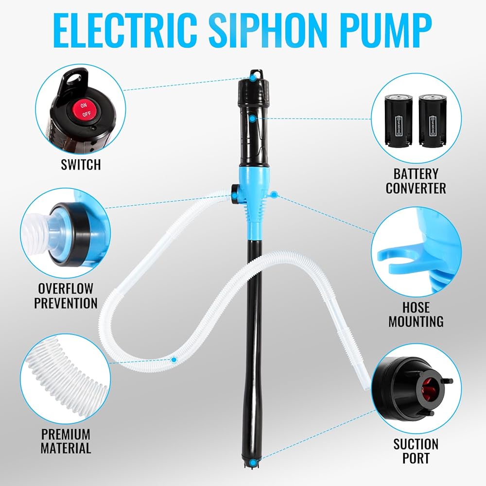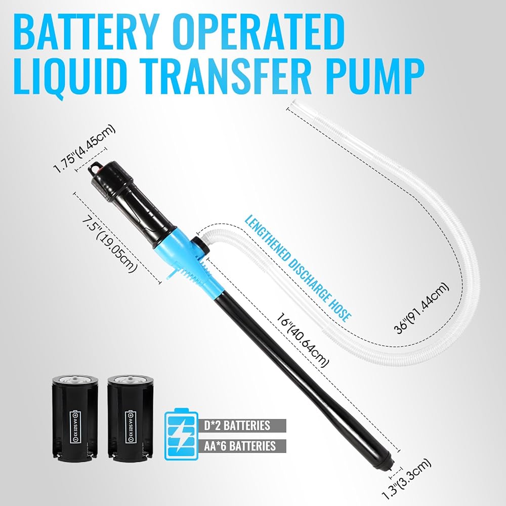 Easy To Use & Gives Your Back A Break:Tired of Spilling Fuel? Our Pump can help and save you the pain and the mess!After installing 6 AA batteries or 2 D batteries(Notes:Requires batteries-not included), All you have to do with this siphon pump is press a button! Operate the Pump with One Hand or totally Hands-Free—No Heavy Lifting!