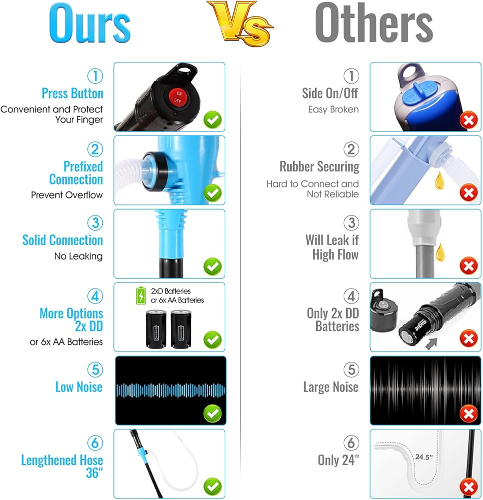 Super Suction Of 7 Quarts Per Minute:With Just 6 AA batteries or 2 D batteries, Move Any Compatible Liquid at Lightning Speed! Increased suctioning power with impeller.Transfers a gallon of liquid in less than 30 seconds!(At the same price, it is definitely the most-affordable!)
