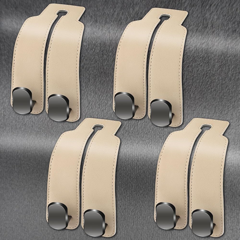 خطافات مسند رأس مقعد السيارة - قل وداعًا لمقاعد السيارة المزدحمة. تحافظ خطافات مقعد السيارة الجلدية الخاصة بنا لمسند الرأس وحامل الهاتف المحمول على ممتلكاتك في متناول اليد، مما يضيف مساحة تخزين إضافية مضاعفة حتى تتمكن من تعليق المزيد من العناصر وتنظيم سيارتك دون أن تفقد أناقتك