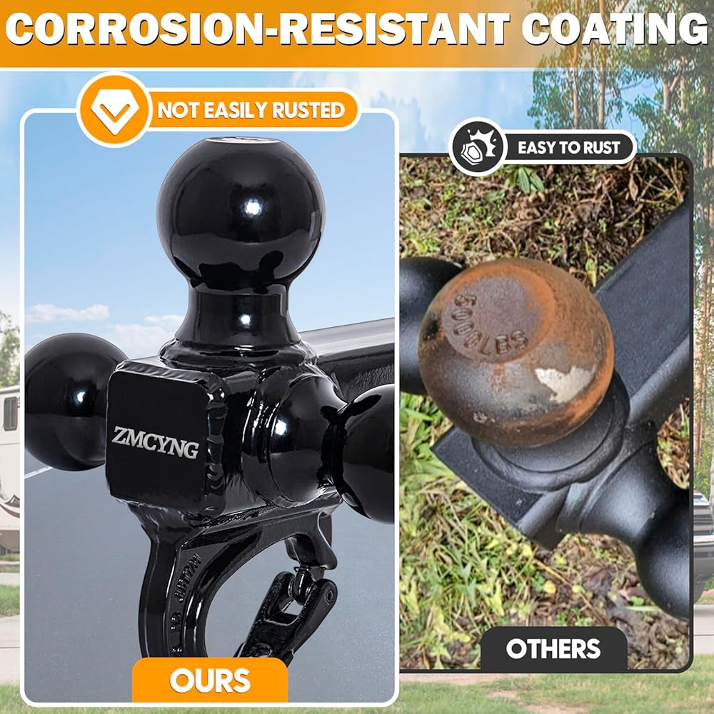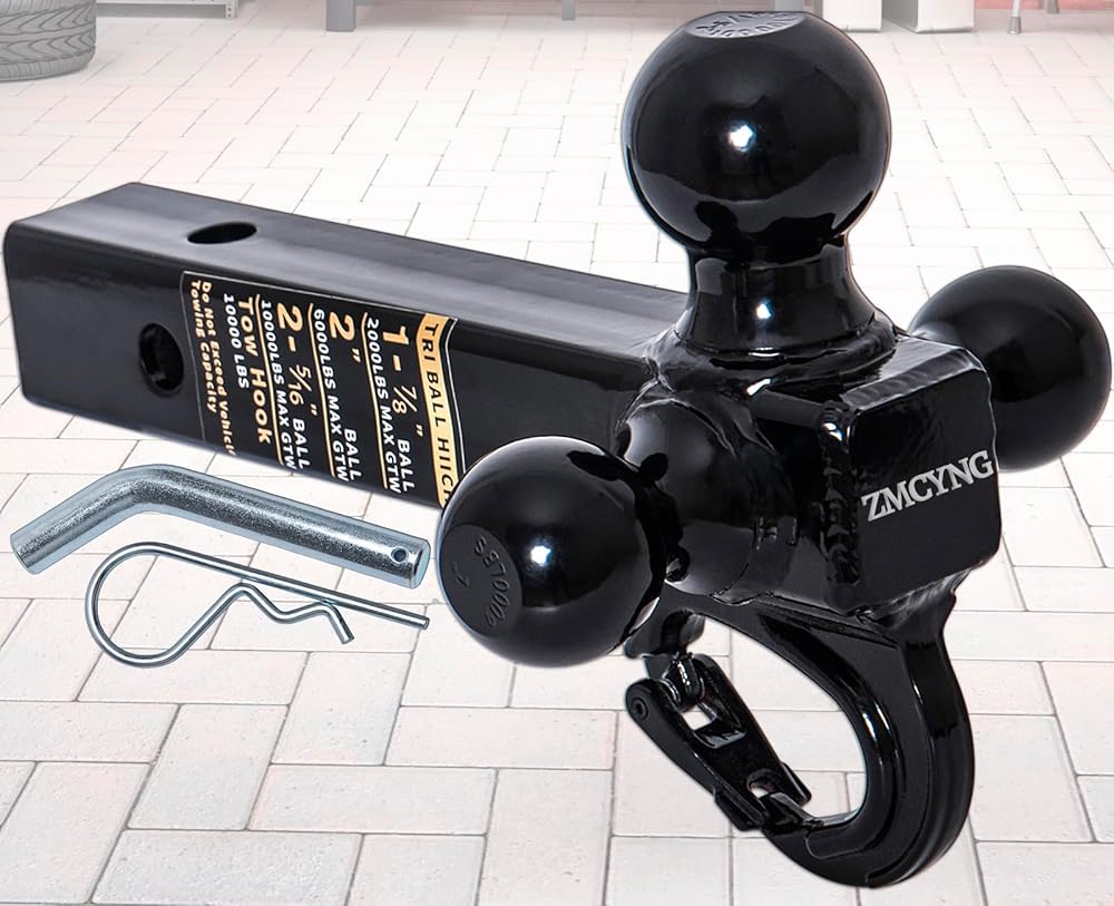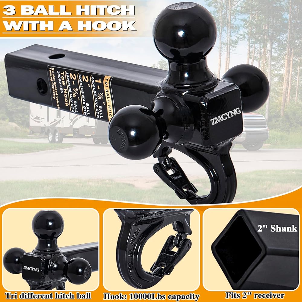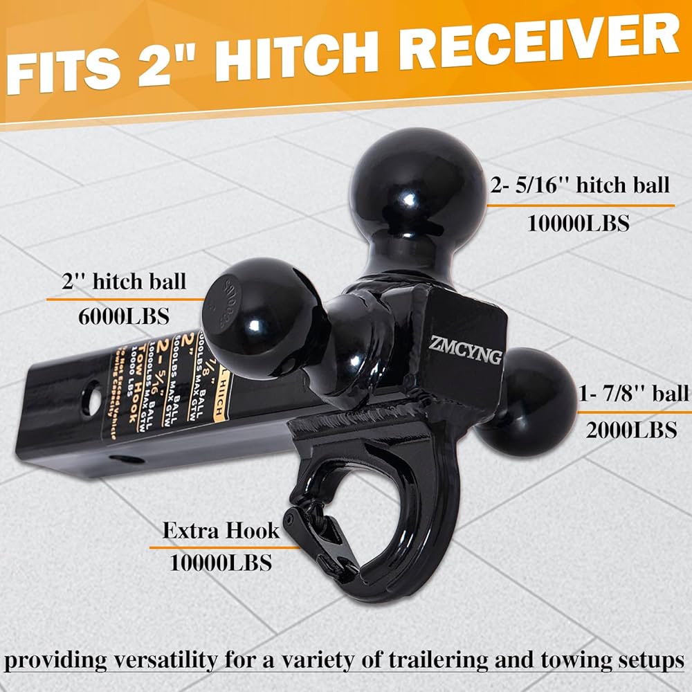 وصلة وصلة مقطورة ثلاثية الكرات مع خطاف، وصلة وصلة سحب ثلاثية الكرات تناسب جهاز استقبال وصلة 2 بوصة، 1-7/8 بوصة، 2 بوصة و2-5/16 بوصة كرات مطلية باللون الأسود لشاحنة سيارات الدفع الرباعي RV ATV، مزلاج آمن ذاتي القفل هوك 10000 رطل