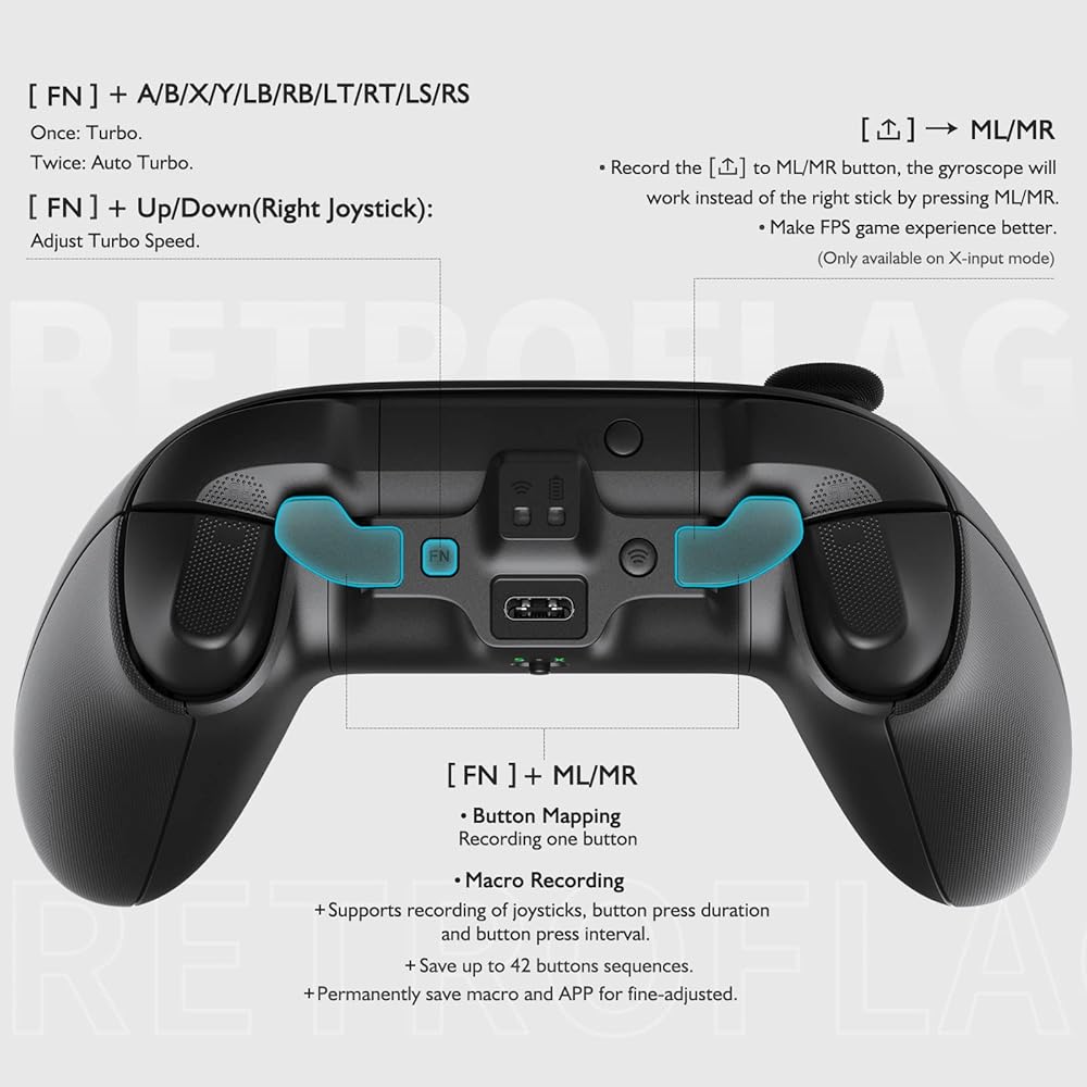 【أزرار البرمجة】 قم بإضفاء الطابع الشخصي على تجربة الألعاب الخاصة بك باستخدام أزرار البرمجة لدينا، ودعم رسم الخرائط أو تسجيل الماكرو على أزرار ML/MR. قم بتسجيل [زر المشاركة] على ML/MR وقم بتنشيط التحكم في الحركة في إدخال X من خلال الضغط باستمرار على زر ML/MR.