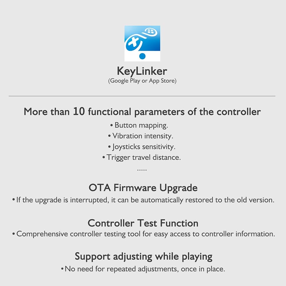 【تطبيق KeyLinker】 قم بتنزيل تطبيق KeyLinker على Google Play (Android) أو متجر التطبيقات (iOS)، لتعيين أو ضبط أكثر من 10 معلمات وظيفية بما في ذلك تعيين الأزرار، وكثافة الاهتزاز، وحساسية عصا التحكم، ومسافة السفر. يمكنك التعديل أثناء التنقل أثناء اللعب!
