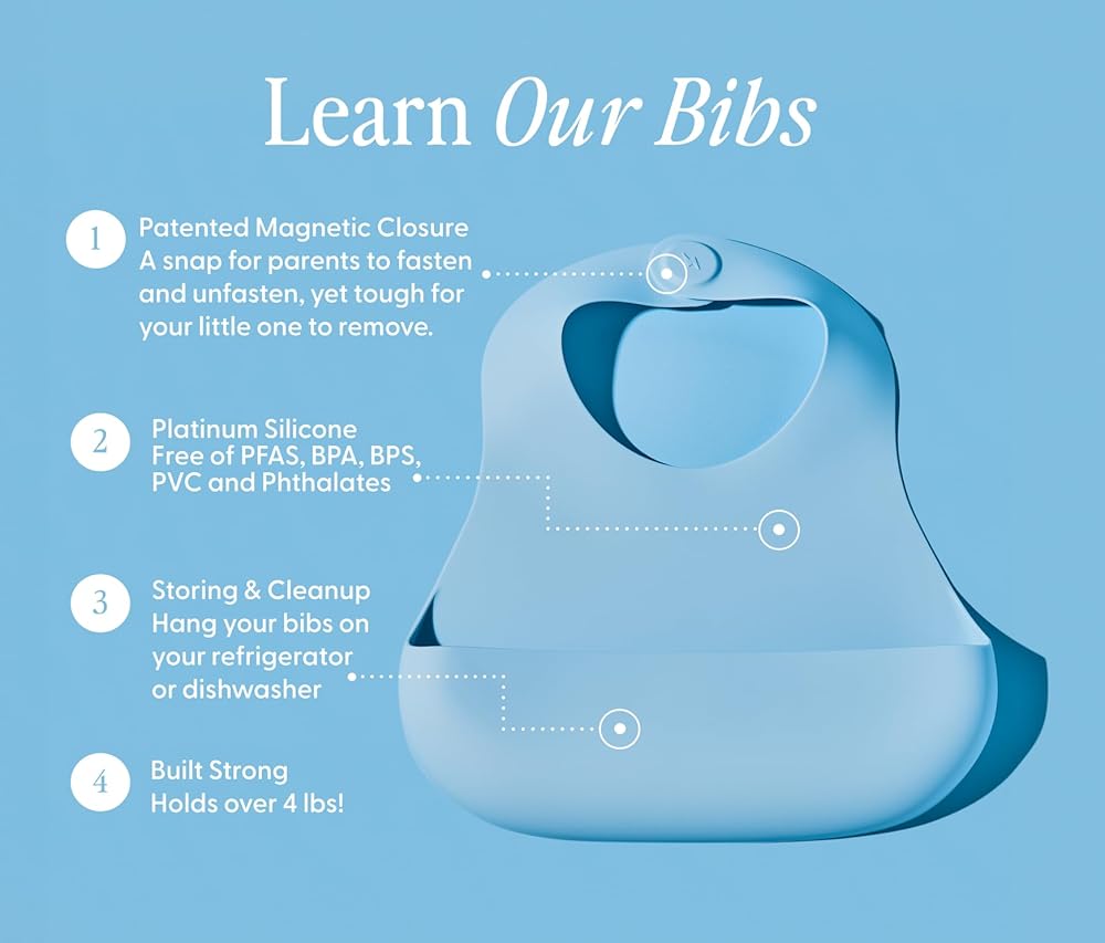 • Platinum Silicone: Our bibs are made with the highest grade of silicone for maximum safety. 100% free of PFAS, BPA, BPS, PVC, and Phthalates.