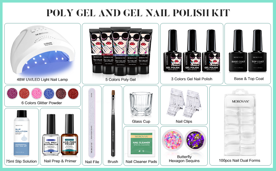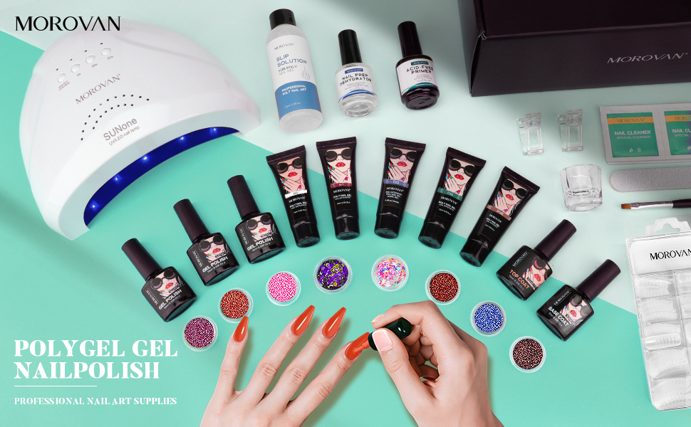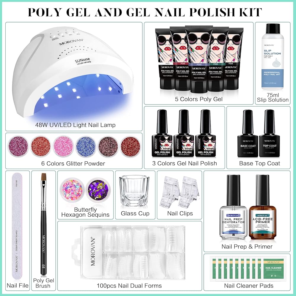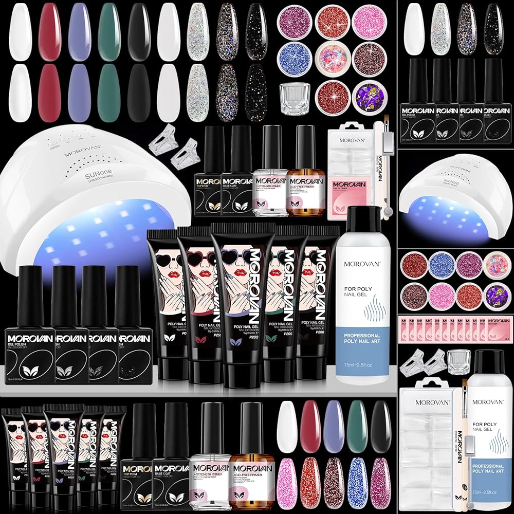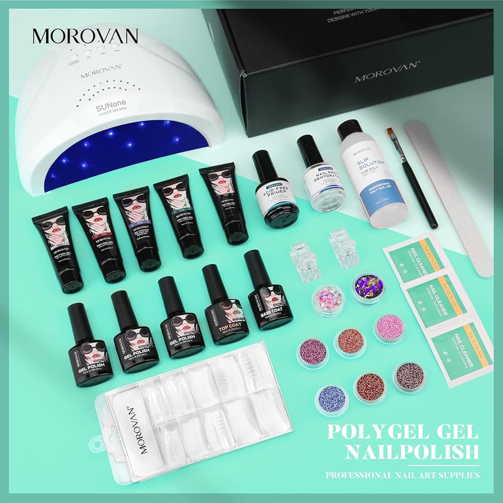 طقم أظافر بولي جل من موروفان مع مصباح أظافر LED بقدرة 48 وات، ومجفف أظافر لامع وإعدادات برايمر بولي جل للأظافر، جل تمديد للأظافر، مستلزمات فن الأظافر، مجموعات جل بولي مع كل شيء