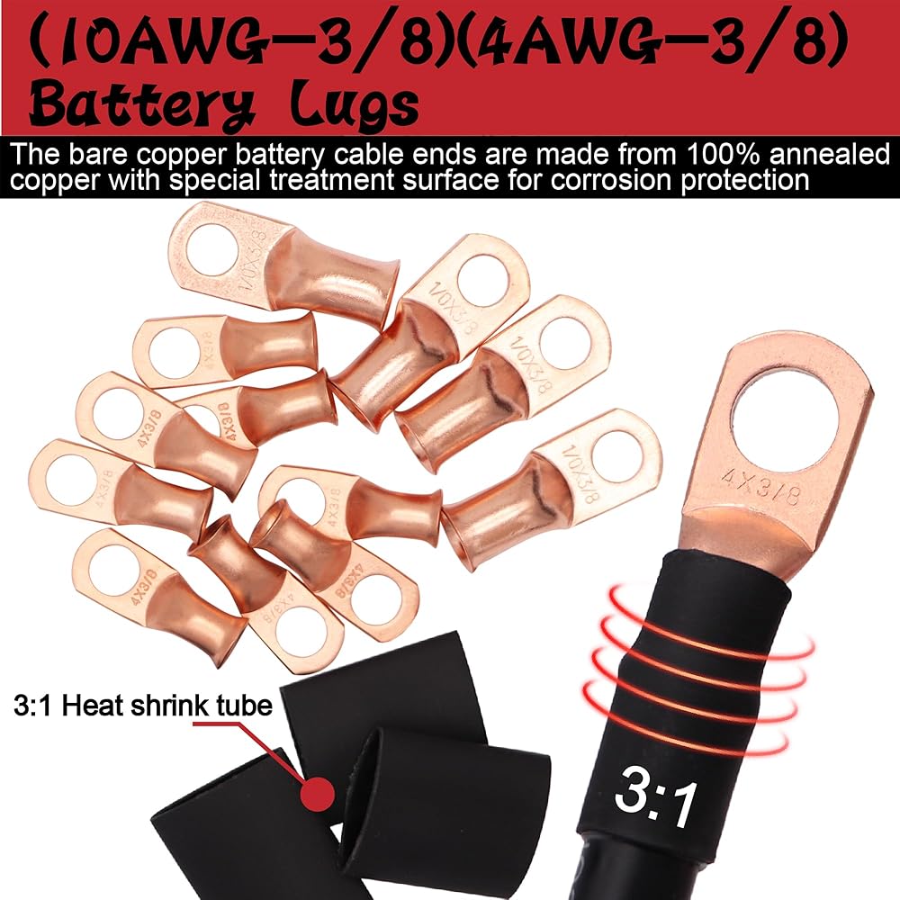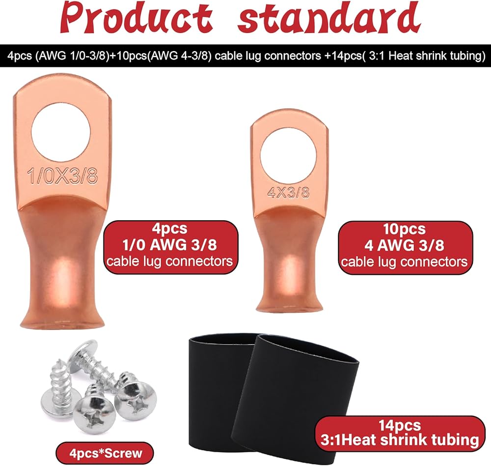 تتضمن الحزمة: 2 قطعة 250A 3/8 بوصة (M10) 4 عمود ناقل البريد (أحمر وأسود) + 10 قطعة AWG4 * 3/8 العروات + 4 قطعة AWG1/0*3/8 العروات + 14 قطعة 3:1 أنابيب الانكماش الحراري