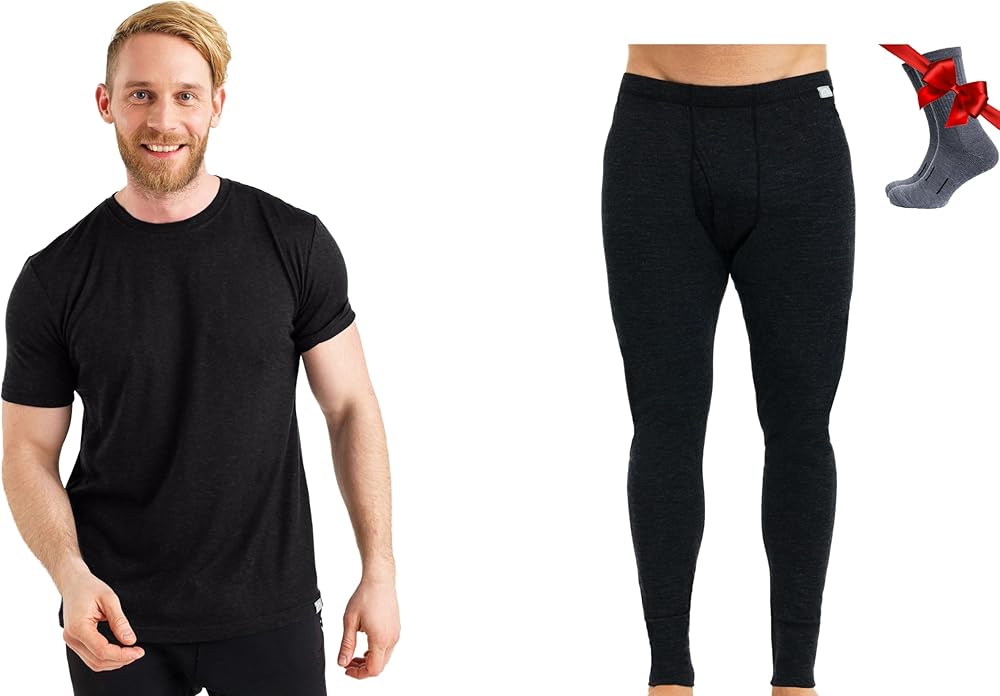 خفيفة الوزن - تتضمن العبوة طبقة أساسية خفيفة الوزن من صوف ميرينو للرجال 165 جم/م2 + جوارب صوف ميرينو للمشي لمسافات طويلة. يُشكل هدية رائعة!