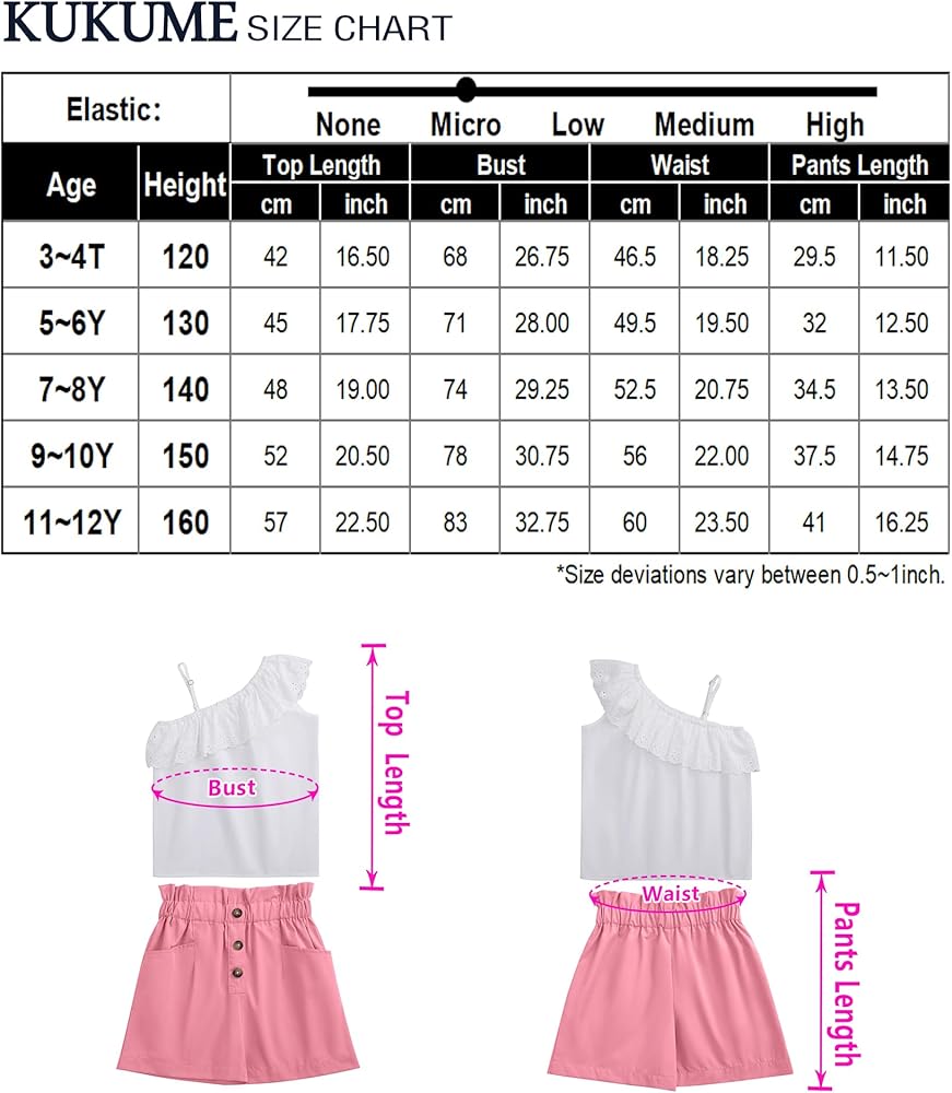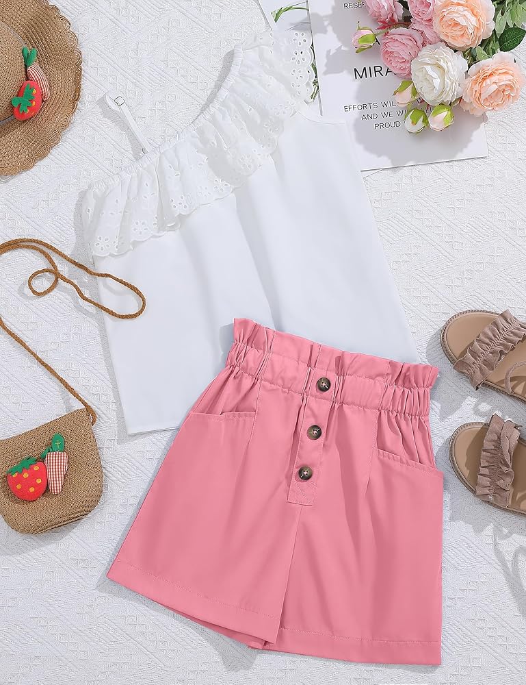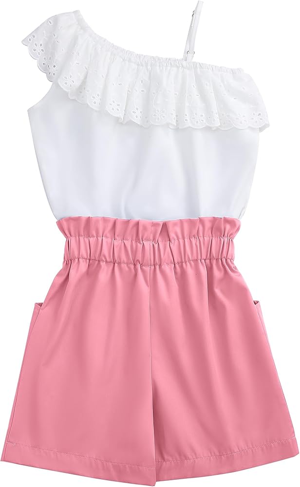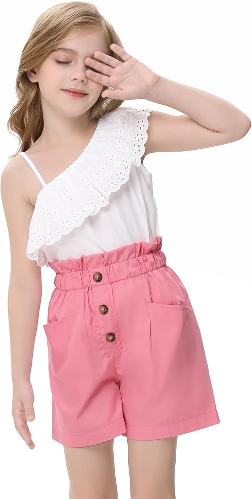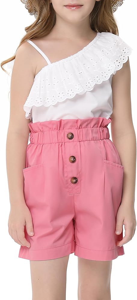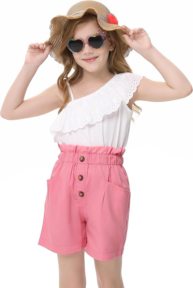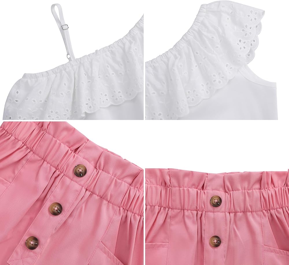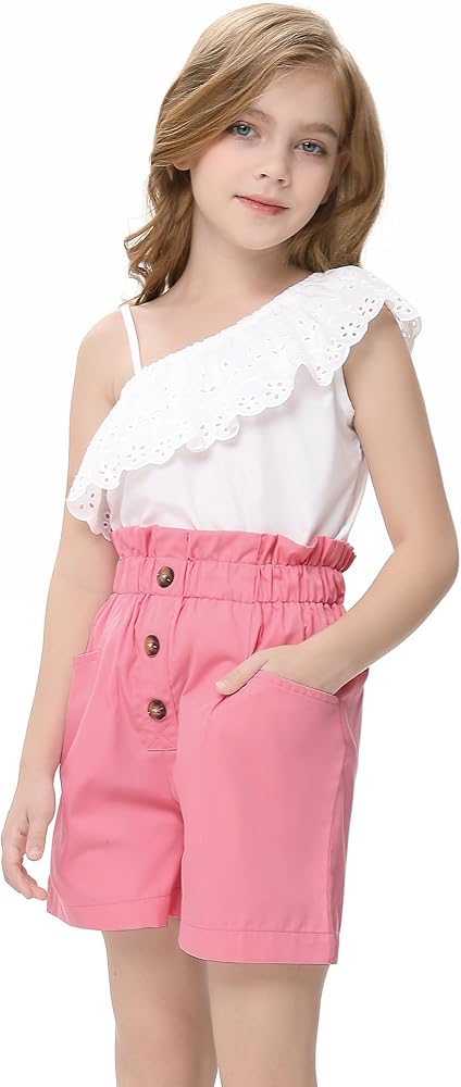 LIONJIE Girls' 2 Piece Outfit One Shoulder Ruffle Collar Sleeveless Tank Top and Shorts Set 3-12 Years
