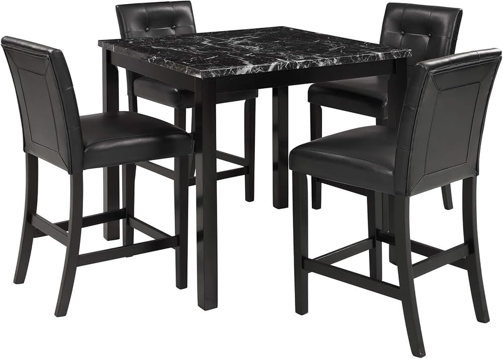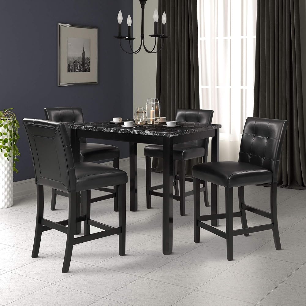 طاولة رخامية صناعية من HAUSHECK وكراسي ارتفاع مضادة 4 أشخاص، وسادة منجدة من جلد البولي يوريثان، مسند ظهر معنقدة بأزرار، إطار خشبي مطاطي، مجموعة حجرة طعام حديثة لغرفة الطعام للمساحات الصغيرة، أسود