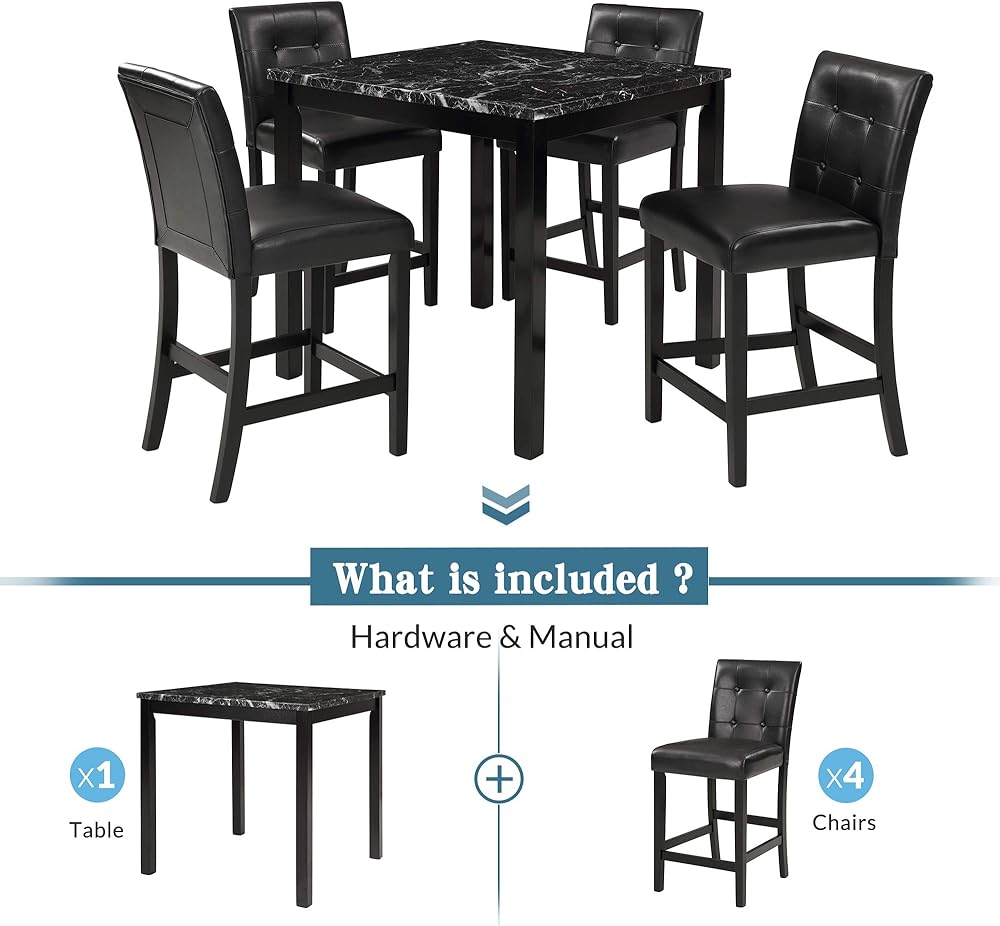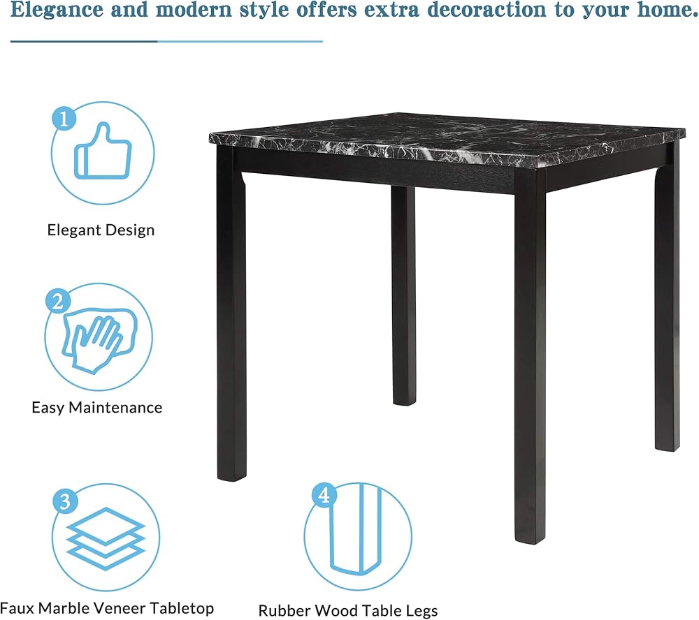 • 💕💕[5-Piece Kitchen Table Set] Pieces Included: 1 table +4 chairs. Say goodbye to stylistic mediocrity. This 5-Piece dining set adds a modern twist with a distinctively glossy appearance and a marbleized wooden tabletop.