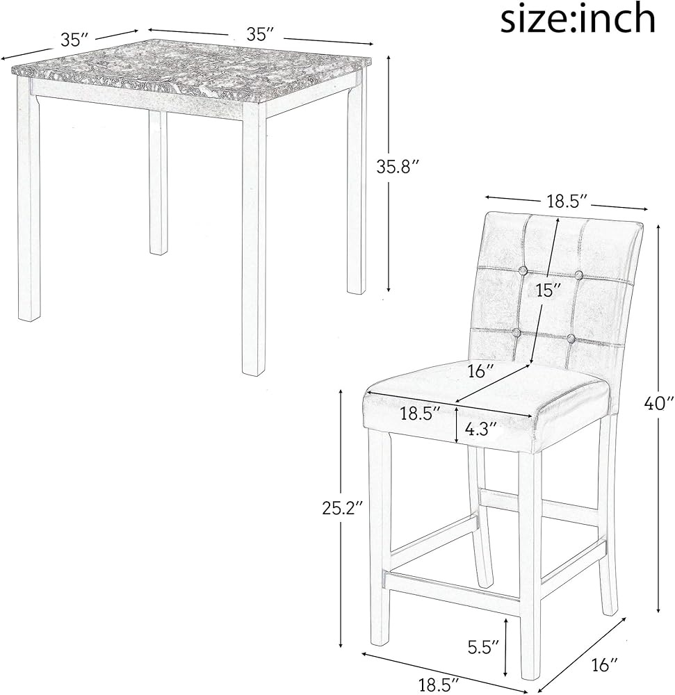 • 💕💕[Dimensions] 1 x Counter Height Dining Table: 35" L x 35" W x 35.8" H; 4 x Counter Height Dining Chairs: 18.5" L x 16" W x 40" H. 2 boxes in total which may not come together.💕💕 There are 2 packages that may arrive at the diffirent time.