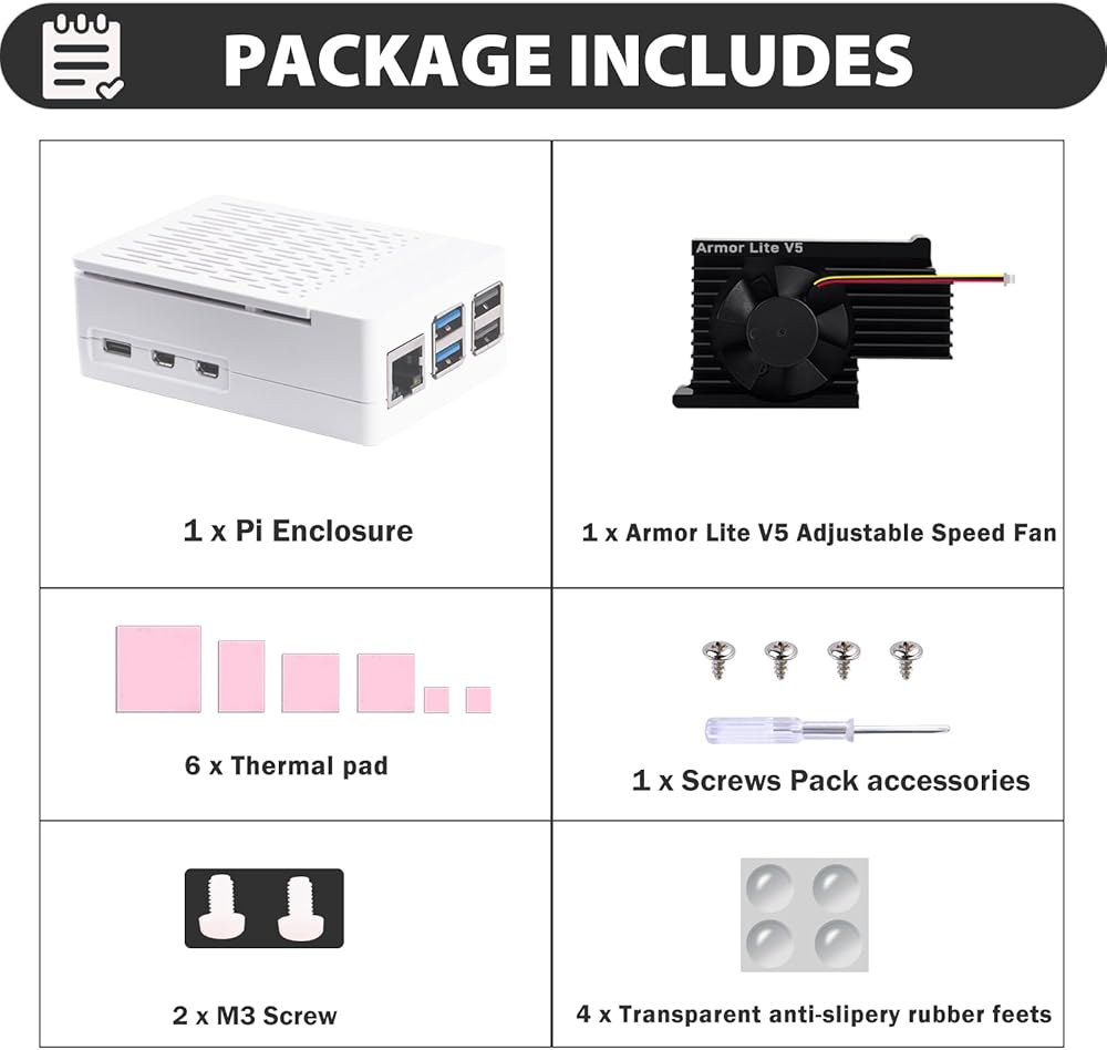 Package Includes - 1x ABS Case for Raspberry Pi 5, 1x Armor Lite V5 Cooler for Raspberry Pi 5, 1x Thermal Pads Pack, 1x Screw Pack, 1x Screw Driver